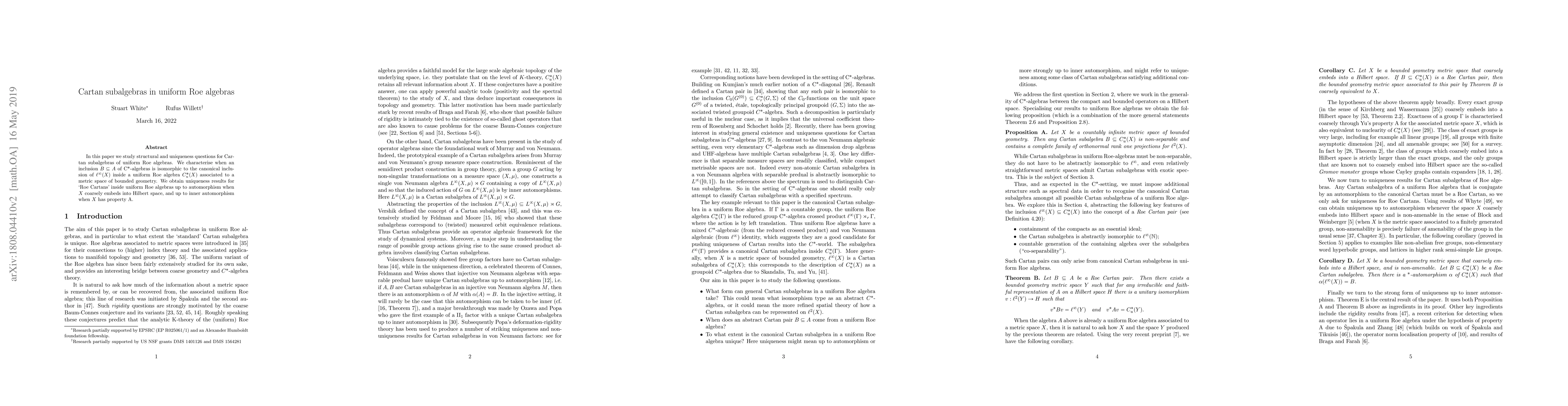 In this paper we study structural and uniqueness questions for Cartan subalgebras of uniform Roe algebras. We characterise when an inclusion $B\subseteq A$ of $\mathrm{C}^*$-algebras is isomorphic to the canonical inclusion of $\ell^\infty(X)$ inside a uniform Roe algebra $C^*_u(X)$ associated to a metric space of bounded geometry. We obtain uniqueness results for `Roe Cartans' inside uniform Roe algebras up to automorphism when $X$ coarsely embeds into Hilbert space, and up to inner automorphism when $X$ has property A.