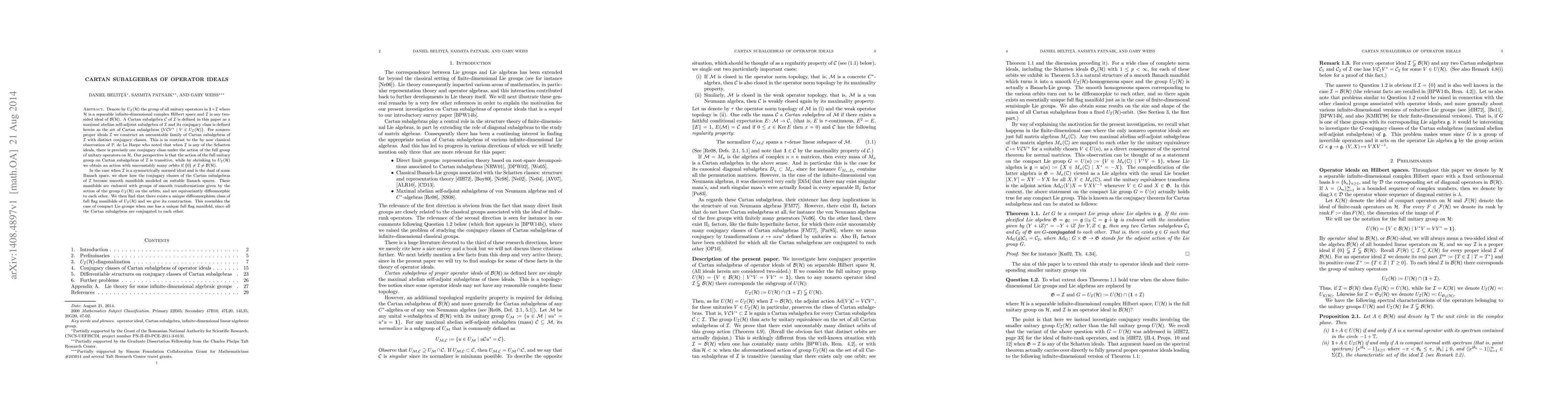 Denote by $U_{\mathcal I}({\mathcal H})$ the group of all unitary operators in ${\bf 1}+{\mathcal I}$ where ${\mathcal H}$ is a separable infinite-dimensional complex Hilbert space and ${\mathcal I}$ is any two-sided ideal of ${\mathcal B}({\mathcal H})$. A Cartan subalgebra ${\mathcal C}$ of ${\mathcal I}$ is defined in this paper as a maximal abelian self-adjoint subalgebra of~${\mathcal I}$ and its conjugacy class is defined herein as the set of Cartan subalgebras $\{V{\mathcal C} V^*\mid V\in U_{\mathcal I}({\mathcal H})\}$. For nonzero proper ideals ${\mathcal I}$ we construct an uncountable family of Cartan subalgebras of ${\mathcal I}$ with distinct conjugacy classes. This is in contrast to the by now classical observation of P. de La Harpe who noted that when ${\mathcal I}$ is any of the Schatten ideals, there is precisely one conjugacy class under the action of the full group of unitary operators on~${\mathcal B}$. In the case when ${\mathcal I}$ is a symmetrically normed ideal and is the dual of some Banach space, we show how the conjugacy classes of the Cartan subalgebras of ${\mathcal I}$ become smooth manifolds modeled on suitable Banach spaces. These manifolds are endowed with groups of smooth transformations given by the action of the group $U_{\mathcal I}({\mathcal H})$ on the orbits, and are equivariantly diffeomorphic to each other. We then find that there exists a unique diffeomorphism class of full flag manifolds of $U_{\mathcal I}({\mathcal H})$ and we give its construction.