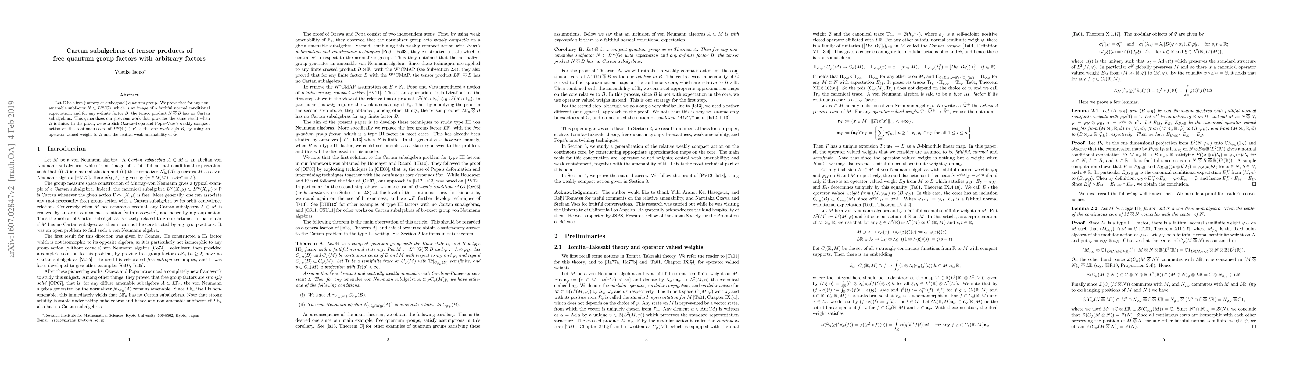 Let $\mathbb{G}$ be a free (unitary or orthogonal) quantum group. We prove that for any non-amenable subfactor $N\subset L^\infty(\mathbb{G})$, which is an image of a faithful normal conditional expectation, and for any $\sigma$-finite factor $B$, the tensor product $N \otimes B$ has no Cartan subalgebras. This generalizes our previous work that provides the same result when $B$ is finite. In the proof, we establish Ozawa--Popa and Popa--Vaes's weakly compact action on the continuous core of $N \otimes B$ as the one relative to B, by using an operator valued weight to B and the central weak amenability of $\mathbb{G}$.