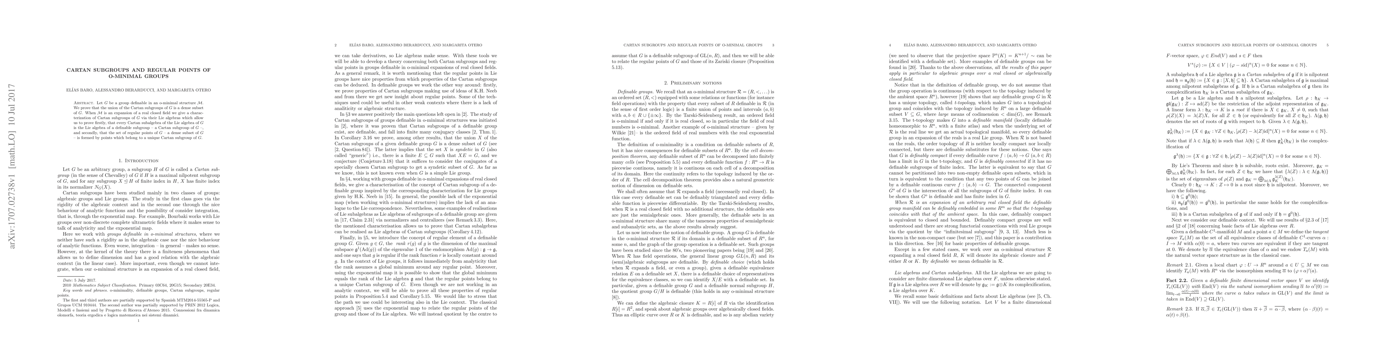 Summary: The paper demonstrates that the union of Cartan subgroups in a group definable within an o-minimal structure forms a dense subset. For expansions of real closed fields, it characterizes Cartan subgroups via their Lie algebras, proving that each Cartan subalgebra corresponds to a definable Cartan subgroup and that regular points of the group, forming a dense subset, belong uniquely to one such subgroup.