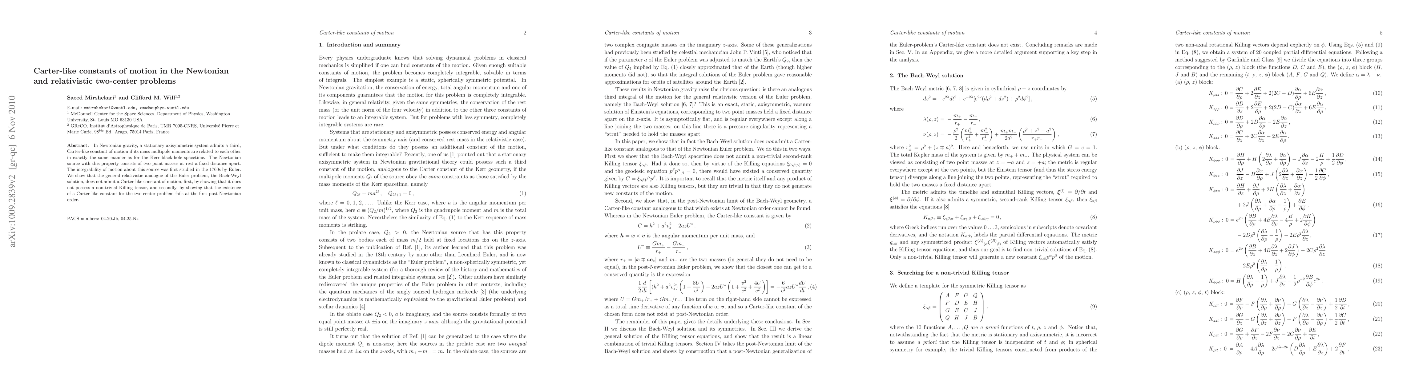 In Newtonian gravity, a stationary axisymmetric system admits a third, Carter-like constant of motion if its mass multipole moments are related to each other in exactly the same manner as for the Kerr black-hole spacetime. The Newtonian source with this property consists of two point masses at rest a fixed distance apart. The integrability of motion about this source was first studied in the 1760s by Euler. We show that the general relativistic analogue of the Euler problem, the Bach-Weyl solution, does not admit a Carter-like constant of motion, first, by showing that it does not possess a non-trivial Killing tensor, and secondly, by showing that the existence of a Carter-like constant for the two-center problem fails at the first post-Newtonian order.