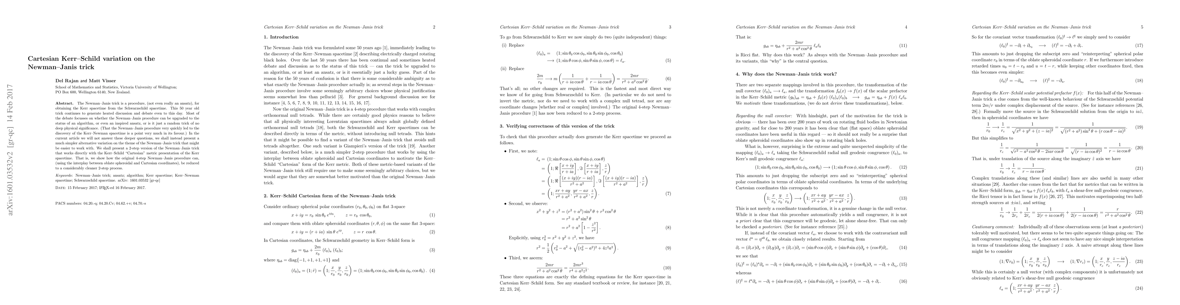 The Newman-Janis trick is a procedure, (not even really an ansatz), for obtaining the Kerr spacetime from the Schwarzschild spacetime. This 50 year old trick continues to generate heated discussion and debate even to this day. Most of the debate focusses on whether the Newman-Janis procedure can be upgraded to the status of an algorithm, or even an inspired ansatz, or is it just a random trick of no deep physical significance. (That the Newman-Janis procedure very quickly led to the discovery of the Kerr-Newman spacetime is a point very much in its favour.) In the current article we will not answer these deeper questions, we shall instead present a much simpler alternative variation on the theme of the Newman--Janis trick that might be easier to work with. We shall present a 2-step version of the Newman-Janis trick that works directly with the Kerr-Schild "Cartesian" metric presentation of the Kerr spacetime. That is, we show how the original 4-step Newman-Janis procedure can, (using the interplay between oblate spheroidal and Cartesian coordinates), be reduced to a considerably cleaner 2-step process.
