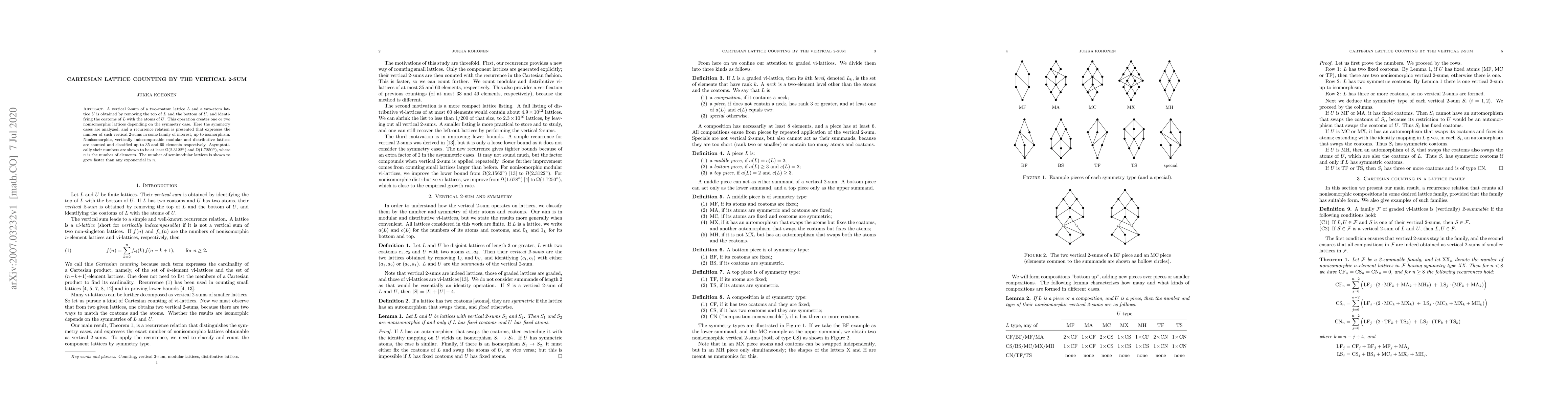A vertical 2-sum of a two-coatom lattice $L$ and a two-atom lattice $U$ is obtained by removing the top of $L$ and the bottom of $U$, and identifying the coatoms of $L$ with the atoms of $U$. This operation creates one or two nonisomorphic lattices depending on the symmetry case. Here the symmetry cases are analyzed, and a recurrence relation is presented that expresses the number of such vertical 2-sums in some family of interest, up to isomorphism. Nonisomorphic, vertically indecomposable modular and distributive lattices are counted and classified up to 35 and 60 elements respectively. Asymptotically their numbers are shown to be at least $\Omega(2.3122^n)$ and $\Omega(1.7250^n)$, where $n$ is the number of elements. The number of semimodular lattices is shown to grow faster than any exponential in $n$.