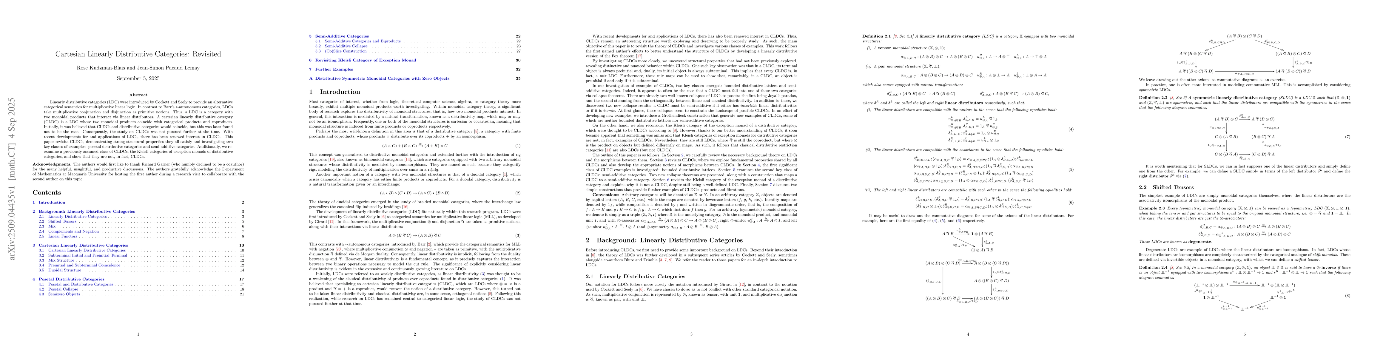 Linearly distributive categories (LDC) were introduced by Cockett and Seely to provide an alternative categorical semantics for multiplicative linear logic. In contrast to Barr's $\ast$-autonomous categories, LDCs take multiplicative conjunction and disjunction as primitive notions. Thus, a LDC is a category with two monoidal products that interact via linear distributors. A cartesian linearly distributive category (CLDC) is a LDC whose two monoidal products coincide with categorical products and coproducts. Initially, it was believed that CLDCs and distributive categories would coincide, but this was later found not to be the case. Consequently, the study on CLDCs was not pursued further at the time. With recent developments for and applications of LDCs, there has been renewed interest in CLDCs. This paper revisits CLDCs, demonstrating strong structural properties they all satisfy and investigating two key classes of examples: posetal distributive categories and semi-additive categories. Additionally, we re-examine a previously assumed class of CLDCs, the Kleisli categories of exception monads of distributive categories, and show that they are not, in fact, CLDCs.