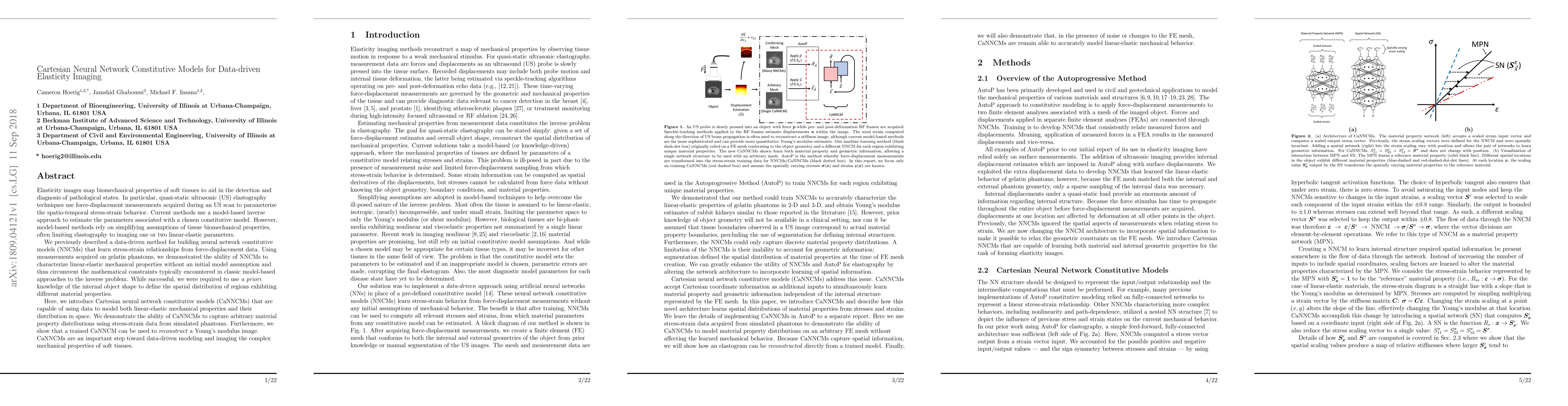 Elasticity images map biomechanical properties of soft tissues to aid in the detection and diagnosis of pathological states. In particular, quasi-static ultrasonic (US) elastography techniques use force-displacement measurements acquired during an US scan to parameterize the spatio-temporal stress-strain behavior. Current methods use a model-based inverse approach to estimate the parameters associated with a chosen constitutive model. However, model-based methods rely on simplifying assumptions of tissue biomechanical properties, often limiting elastography to imaging one or two linear-elastic parameters. We previously described a data-driven method for building neural network constitutive models (NNCMs) that learn stress-strain relationships from force-displacement data. Using measurements acquired on gelatin phantoms, we demonstrated the ability of NNCMs to characterize linear-elastic mechanical properties without an initial model assumption and thus circumvent the mathematical constraints typically encountered in classic model-based approaches to the inverse problem. While successful, we were required to use a priori knowledge of the internal object shape to define the spatial distribution of regions exhibiting different material properties. Here, we introduce Cartesian neural network constitutive models (CaNNCMs) that are capable of using data to model both linear-elastic mechanical properties and their distribution in space. We demonstrate the ability of CaNNCMs to capture arbitrary material property distributions using stress-strain data from simulated phantoms. Furthermore, we show that a trained CaNNCM can be used to reconstruct a Young's modulus image. CaNNCMs are an important step toward data-driven modeling and imaging the complex mechanical properties of soft tissues.