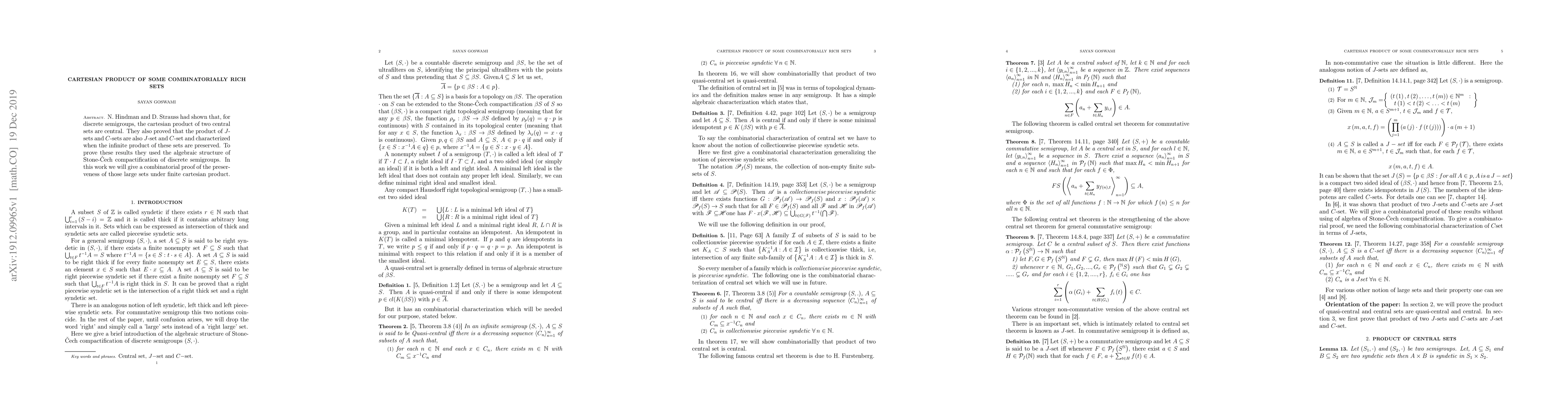 Researchers provide a combinatorial proof that certain large sets in discrete semigroups remain central under finite cartesian product, building on previous work by Hindman and Strauss.