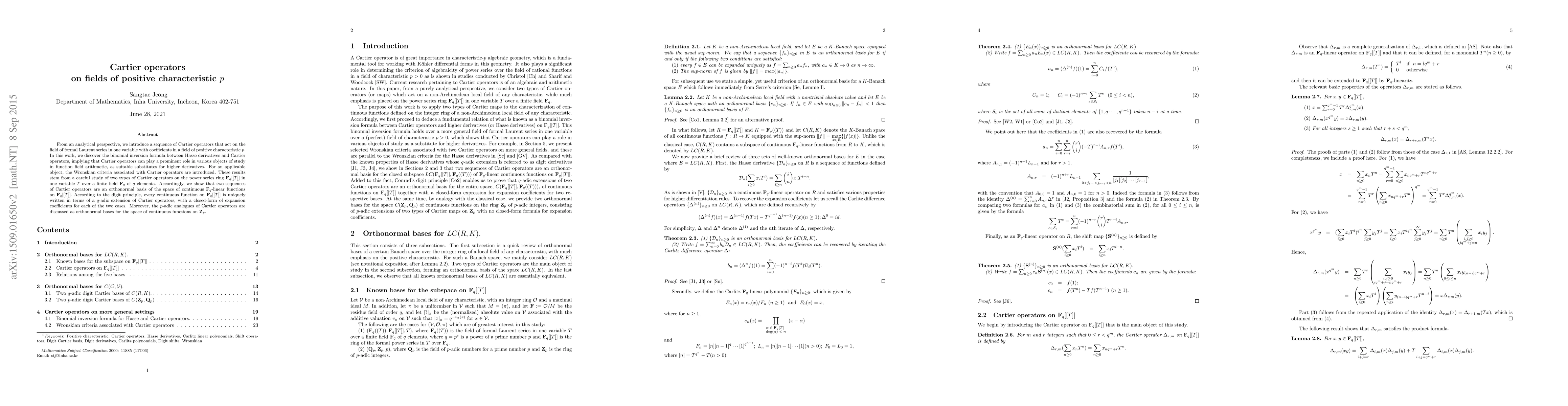 This paper introduces Cartier operators acting on fields of formal Laurent series over positive characteristic fields, revealing a binomial inversion formula linking them to Hasse derivatives. It demonstrates their utility in function field arithmetic and provides orthonormal bases for continuous functions on $\Fq[[T]]$ and $\Zp$.