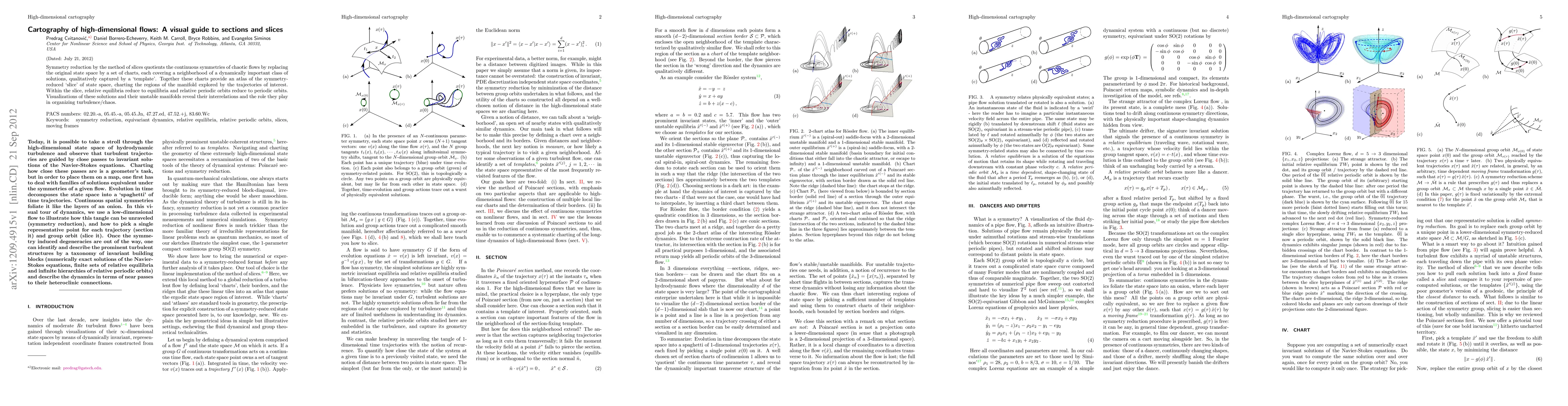 This paper presents a method called 'slices quotients' to simplify visualizing chaotic flows in high-dimensional spaces. It reduces continuous symmetries by mapping the original state space to a collection of charts, each focusing on significant solution classes. These charts create an atlas of the reduced 'slice' space, making it easier to understand equilibria, periodic orbits, and their unstable manifolds, which help organize turbulence/chaos.