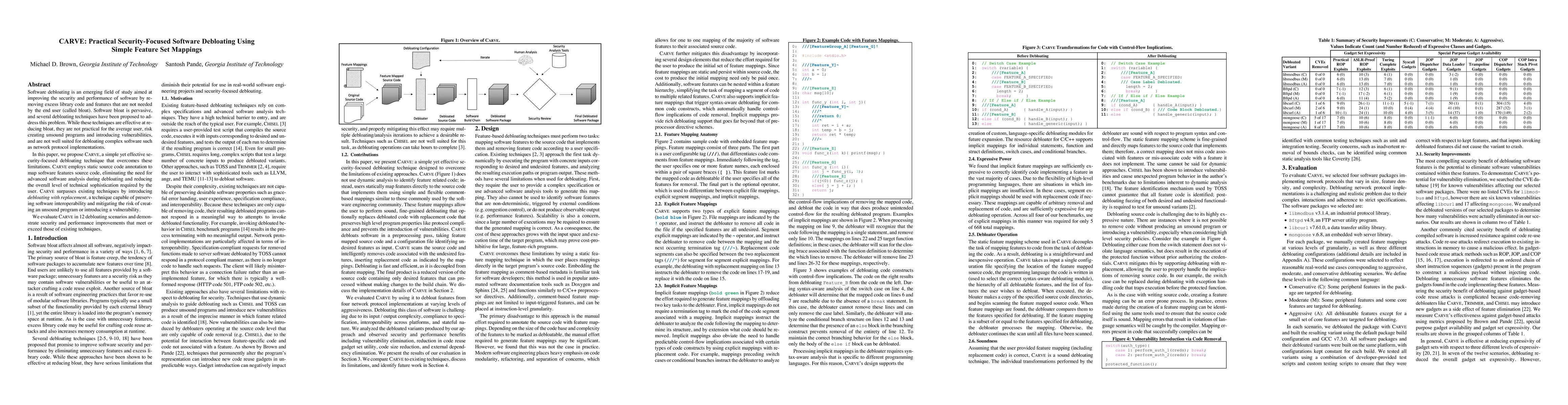 CARVE is a practical, security-focused software debloating method that uses simple feature set mappings to remove unnecessary code without requiring advanced analysis. It effectively enhances security and performance while maintaining software integrity and outperforming existing debloating techniques.