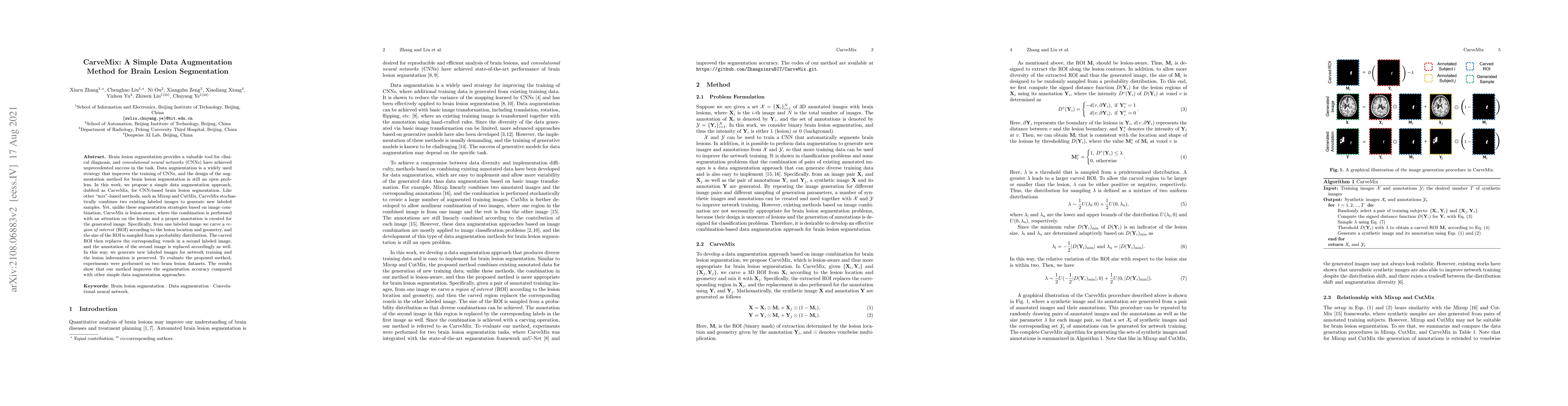 CarveMix is a lesion-aware data augmentation method designed to enhance CNN-based brain lesion segmentation by combining labeled images with attention to lesion regions. Experiments on two datasets demonstrate its effectiveness in improving segmentation accuracy over other simple augmentation techniques.