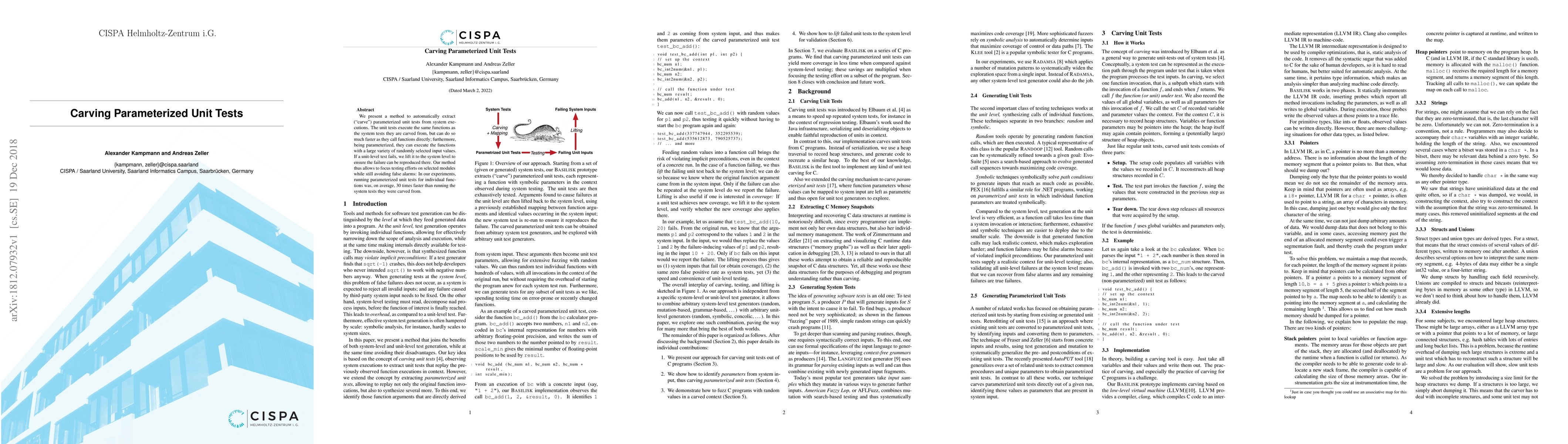 We present a method to automatically extract ("carve") parameterized unit tests from system executions. The unit tests execute the same functions as the system tests they are carved from, but can do so much faster as they call functions directly; furthermore, being parameterized, they can execute the functions with a large variety of randomly selected input values. If a unit-level test fails, we lift it to the system level to ensure the failure can be reproduced there. Our method thus allows to focus testing efforts on selected modules while still avoiding false alarms: In our experiments, running parameterized unit tests for individual functions was, on average, 30~times faster than running the system tests they were carved from.