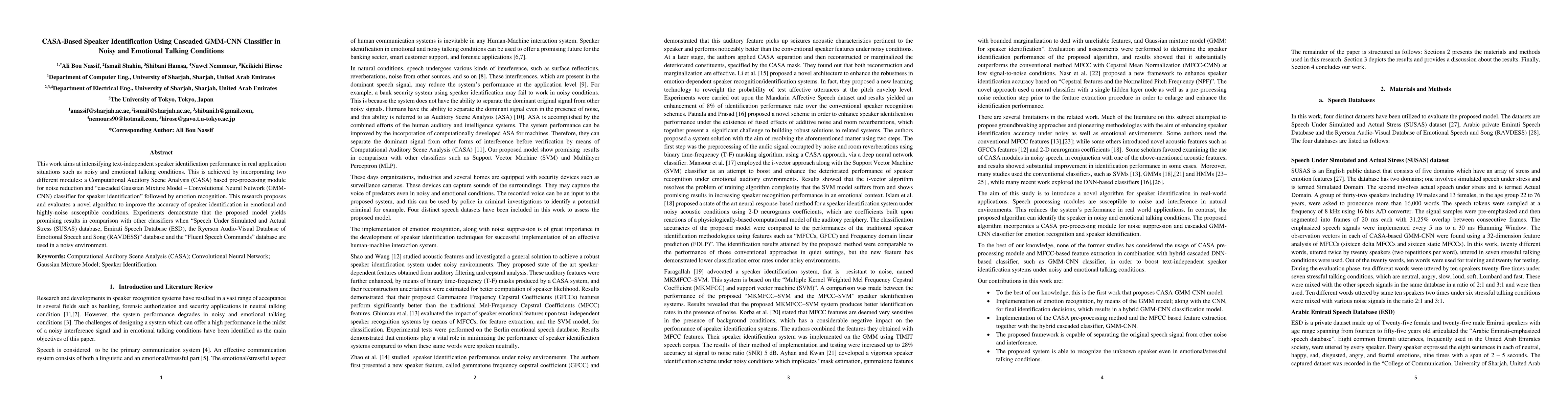 This work aims at intensifying text-independent speaker identification performance in real application situations such as noisy and emotional talking conditions. This is achieved by incorporating two different modules: a Computational Auditory Scene Analysis CASA based pre-processing module for noise reduction and cascaded Gaussian Mixture Model Convolutional Neural Network GMM-CNN classifier for speaker identification followed by emotion recognition. This research proposes and evaluates a novel algorithm to improve the accuracy of speaker identification in emotional and highly-noise susceptible conditions. Experiments demonstrate that the proposed model yields promising results in comparison with other classifiers when Speech Under Simulated and Actual Stress SUSAS database, Emirati Speech Database ESD, the Ryerson Audio-Visual Database of Emotional Speech and Song RAVDESS database and the Fluent Speech Commands database are used in a noisy environment.