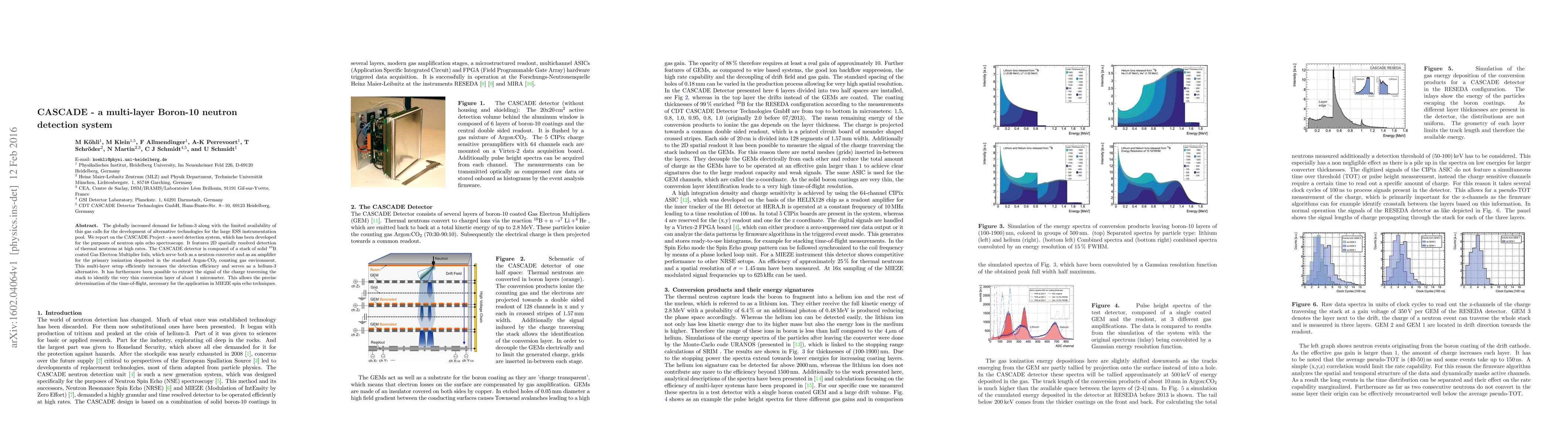 The CASCADE Project introduces a novel multi-layer Boron-10 neutron detection system for high-rate thermal neutron detection, serving as an alternative to helium-3. The system uses boron-10 coated Gas Electron Multiplier foils to enhance detection efficiency and determine time-of-flight for MIEZE spin echo techniques.