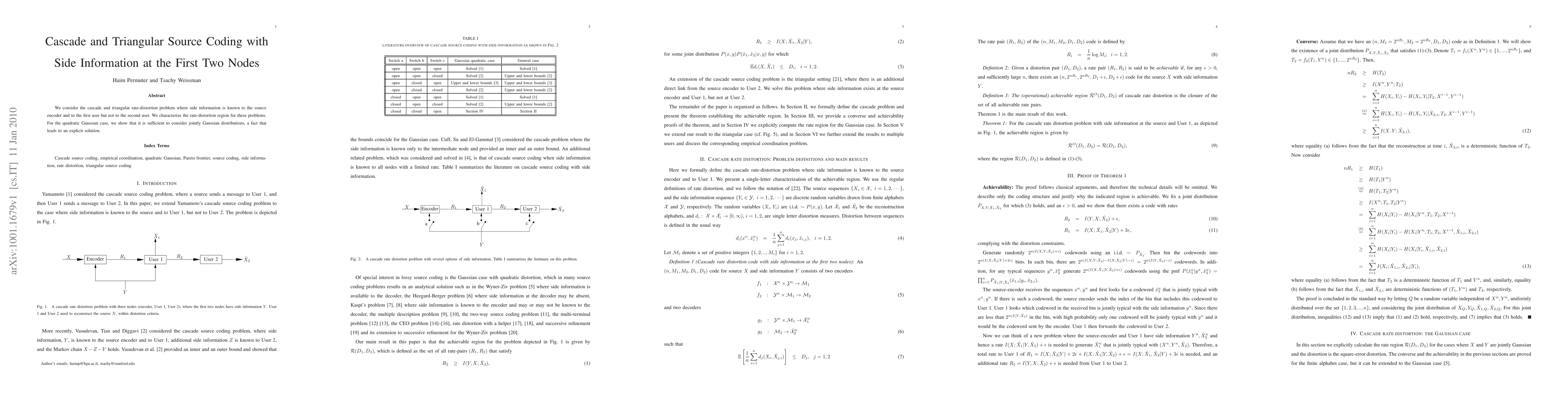 Researchers characterized the rate-distortion region for cascade and triangular source coding problems with side information at the first two nodes. They found that joint Gaussian distributions can simplify analysis in the quadratic Gaussian case.