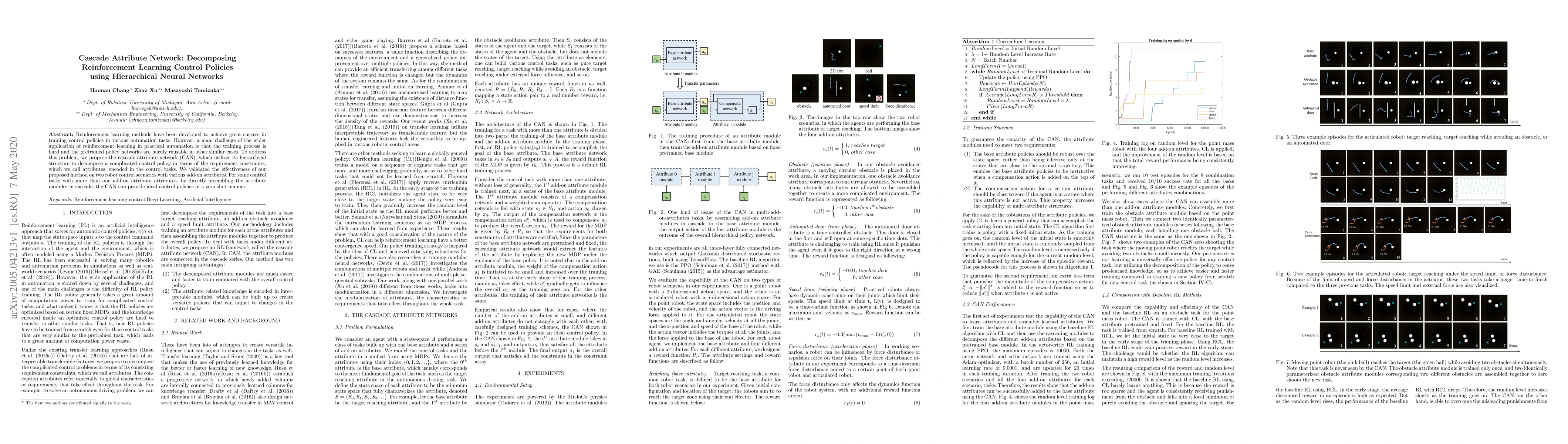 Reinforcement learning methods have been developed to achieve great success in training control policies in various automation tasks. However, a main challenge of the wider application of reinforcement learning in practical automation is that the training process is hard and the pretrained policy networks are hardly reusable in other similar cases. To address this problem, we propose the cascade attribute network (CAN), which utilizes its hierarchical structure to decompose a complicated control policy in terms of the requirement constraints, which we call attributes, encoded in the control tasks. We validated the effectiveness of our proposed method on two robot control scenarios with various add-on attributes. For some control tasks with more than one add-on attribute attribute, by directly assembling the attribute modules in cascade, the CAN can provide ideal control policies in a zero-shot manner.