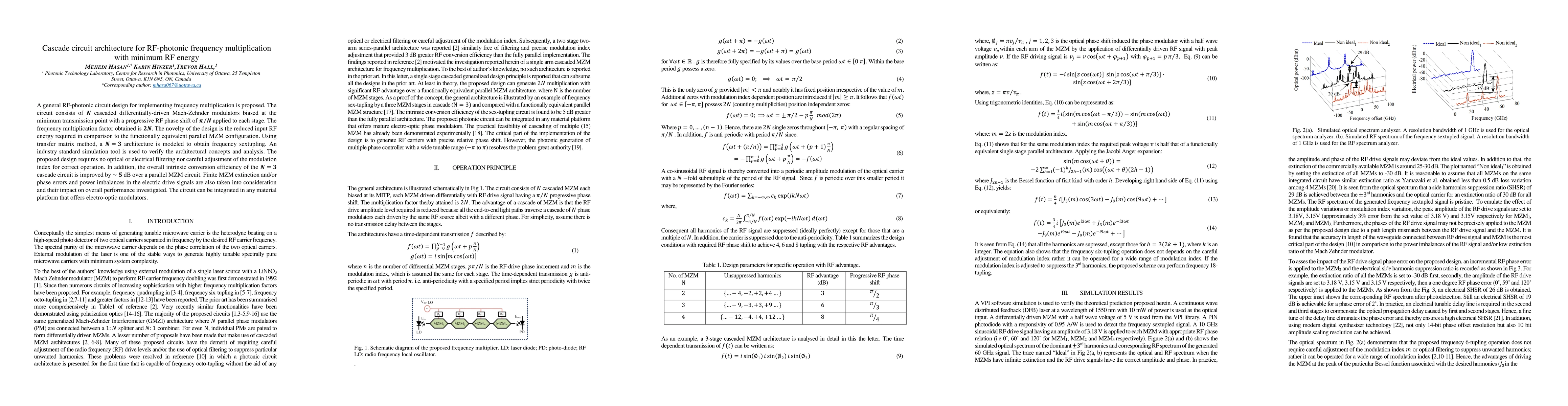 The research proposes a cascade circuit architecture using N cascaded differentially-driven Mach-Zehnder modulators for RF-photonic frequency multiplication, requiring a progressive RF phase shift of 180/N applied to each stage.
