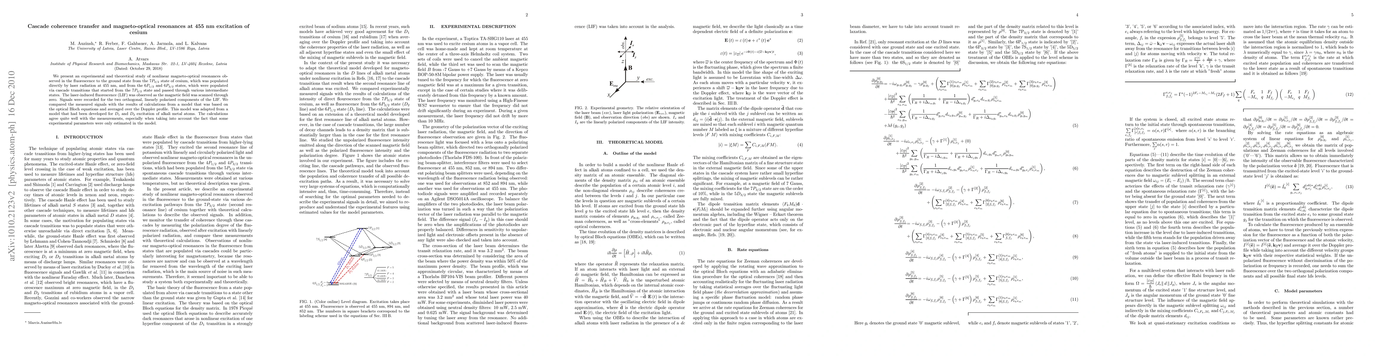 We present and experimental and theoretical study of nonlinear magneto-optical resonances observed in the fluorescence to the ground state from the 7P_{3/2} state of cesium, which was populated directly by laser radiation at 455 nm, and from the 6P_{1/2} and 6P_{3/2} states, which were populated via cascade transitions that started from the 7P_{3/2} state and passed through various intermediate states. The laser-induced fluorescence (LIF) was observed as the magnetic field was scanned through zero. Signals were recorded for the two orthogonal, linearly polarized components of the LIF. We compared the measured signals with the results of calculations from a model that was based on the optical Bloch equations and averaged over the Doppler profile. This model was adapted from a model that had been developed for D_1 and D_2 excitation of alkali metal atoms. The calculations agree quite well with the measurements, especially when taking into account the fact that some experimental parameters were only estimated in the model.