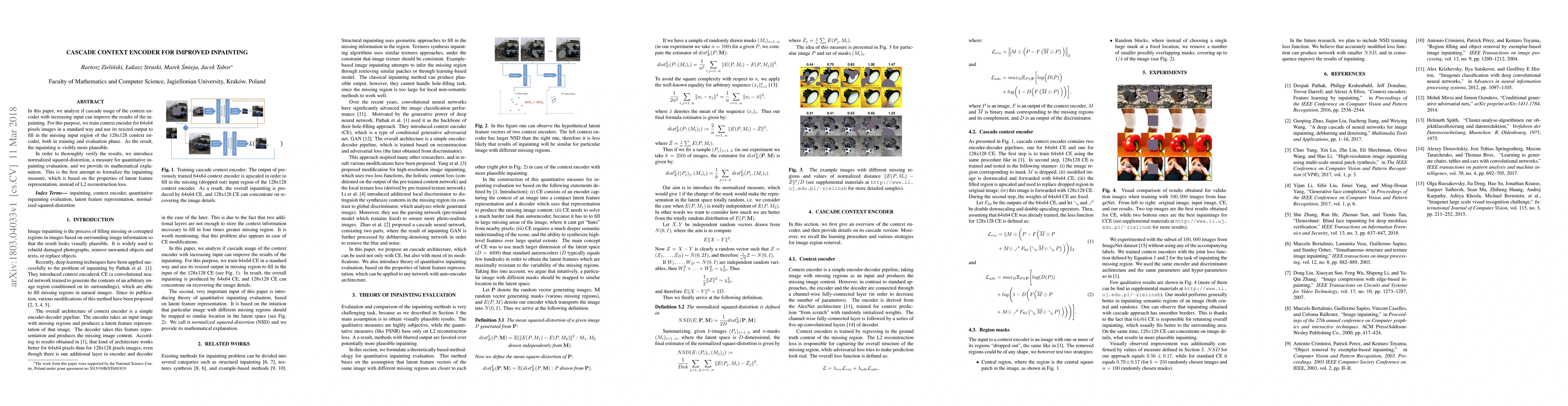 This paper explores the use of a cascade context encoder to enhance image inpainting results by progressively increasing input sizes. The method shows improved plausibility in inpainting, and introduces a new quantitative evaluation measure based on latent feature representation, providing a novel approach to inpainting assessment.