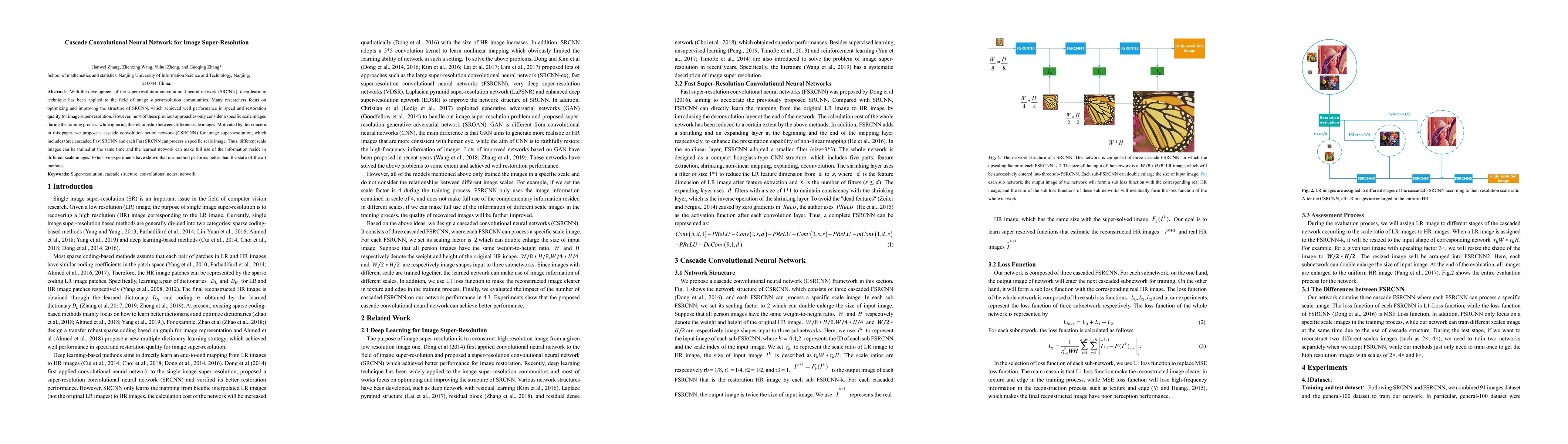 This paper proposes a Cascade Convolutional Neural Network (CSRCNN) for image super-resolution, which consists of three Fast SRCNNs to handle different image scales. The method trains images of various scales simultaneously, leveraging multi-scale information for improved super-resolution performance.
