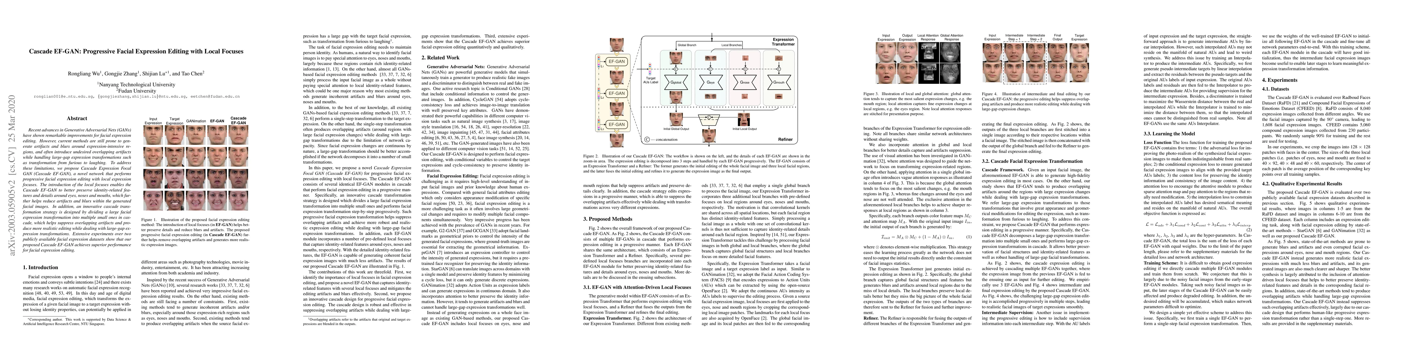 The Cascade EF-GAN proposes a novel progressive facial expression editing method with local focuses to reduce artifacts and blurs, especially in expression-intensive regions. It employs a cascade transformation strategy to handle large-gap expression transformations more realistically, achieving superior performance over existing methods.