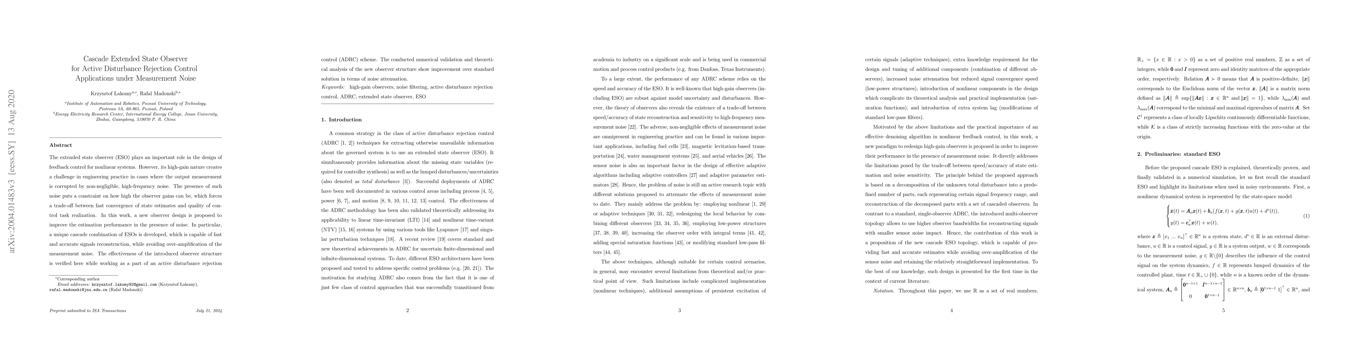 This paper proposes a cascade extended state observer (ESO) design to enhance active disturbance rejection control (ADRC) performance under measurement noise. The new observer structure effectively reconstructs signals and attenuates noise, achieving better estimation performance compared to standard ESOs.