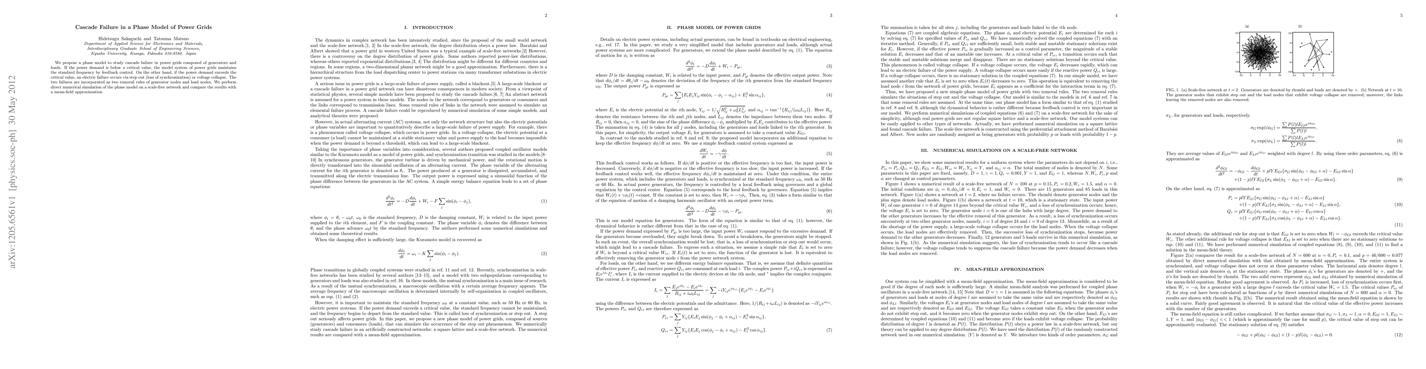 This paper introduces a phase model to analyze cascade failure in power grids, showing how excess demand can lead to synchronization loss or voltage collapse. Numerical simulations on scale-free networks reveal failure dynamics compared to mean-field approximations.