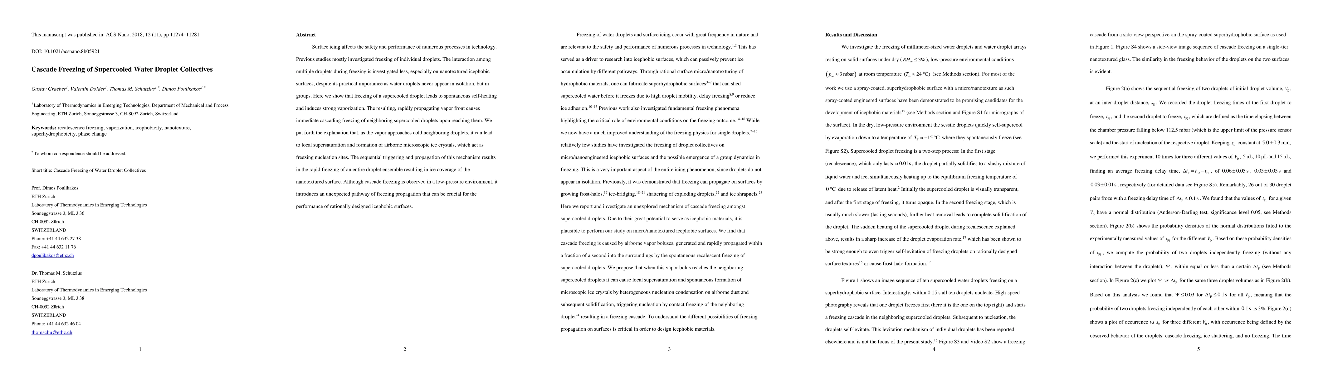 This research investigates the cascading freezing of groups of supercooled water droplets on nanotextured icephobic surfaces, revealing that freezing of one droplet triggers vaporization and induces rapid freezing of neighboring droplets through vapor-induced supersaturation and airborne ice crystal formation. This cascade mechanism presents a novel freezing propagation pathway essential for the design of effective icephobic materials.