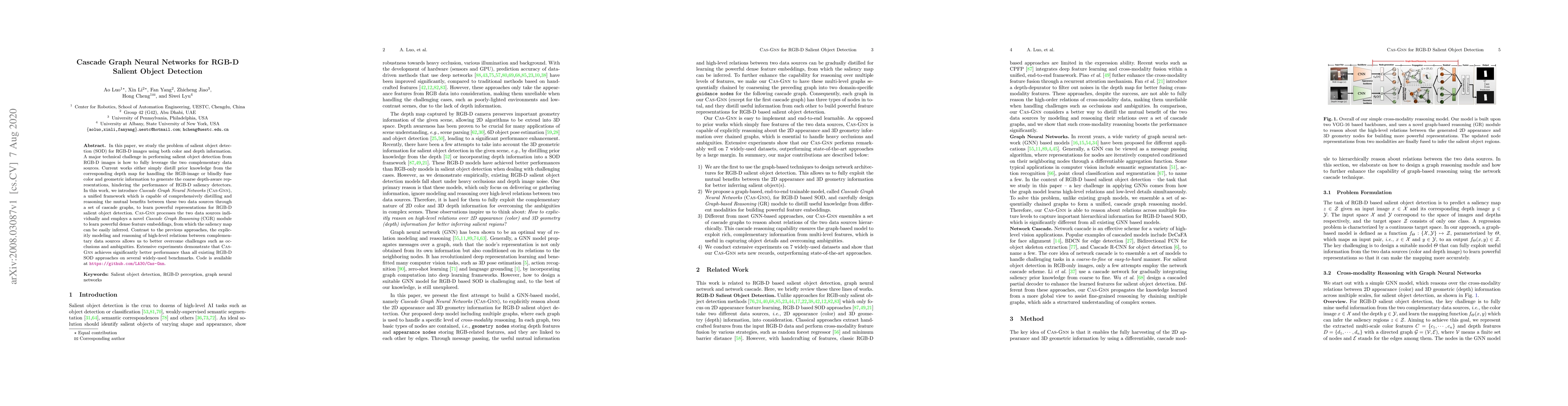 This paper proposes Cascade Graph Neural Networks (Cas-Gnn) to enhance RGB-D salient object detection by leveraging both color and depth information through a novel Cascade Graph Reasoning module. Cas-Gnn outperforms existing methods by better modeling the relationships between complementary data sources, achieving superior performance on benchmark datasets.