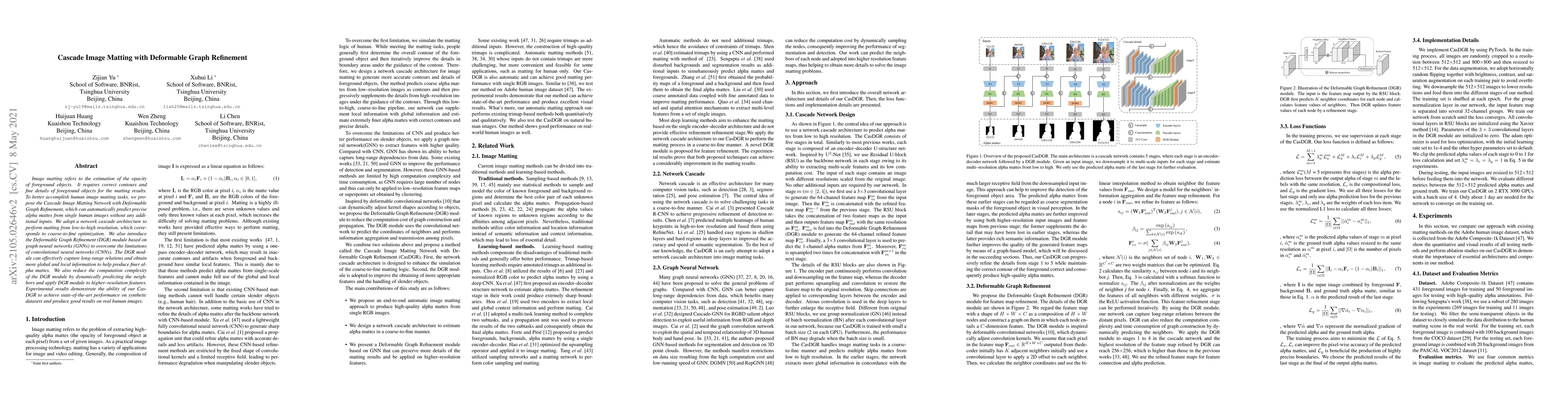 This paper proposes a new method for image matting called Cascade Image Matting Network with Deformable Graph Refinement, which can accurately estimate opacity of foreground objects in single human images without additional inputs. The approach achieves state-of-the-art performance on synthetic datasets and produces good results on real human images.