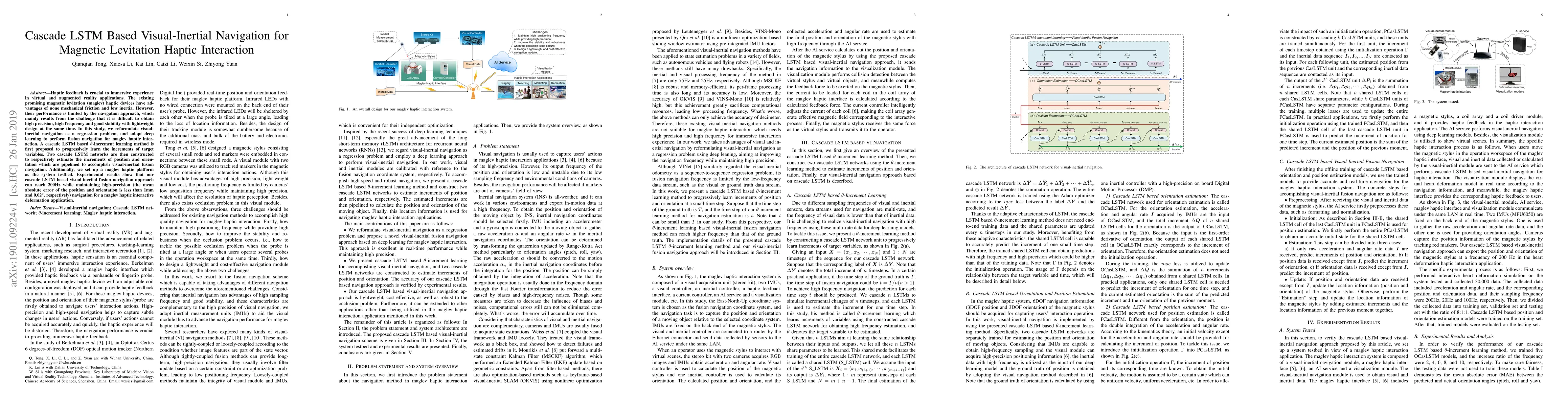 This paper proposes a cascade LSTM-based visual-inertial fusion navigation method for magnetic levitation haptic interaction, achieving high-precision and high frame rate navigation. Experimental results demonstrate the method's effectiveness in maintaining accuracy below 1mm for position and 0.02° for orientation at 200Hz.