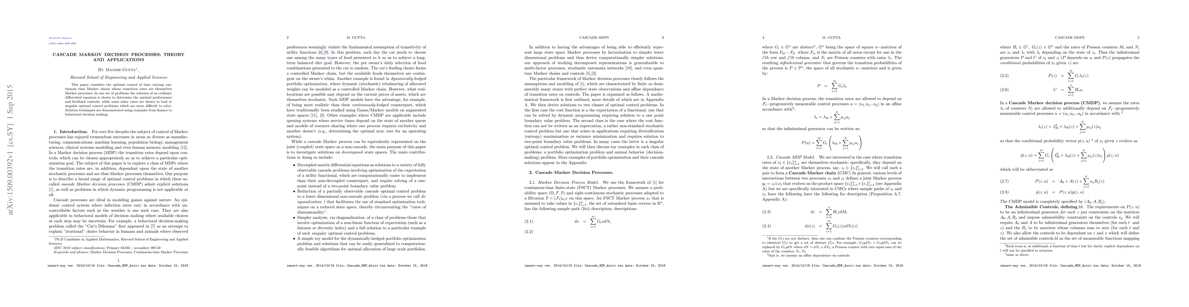 This paper explores the optimal control of time-varying continuous Markov chains with transition rates governed by Markov processes. It demonstrates solution techniques for both ordinary differential equations and singular optimal control problems, illustrated through applications in finance and behavioral decision making.