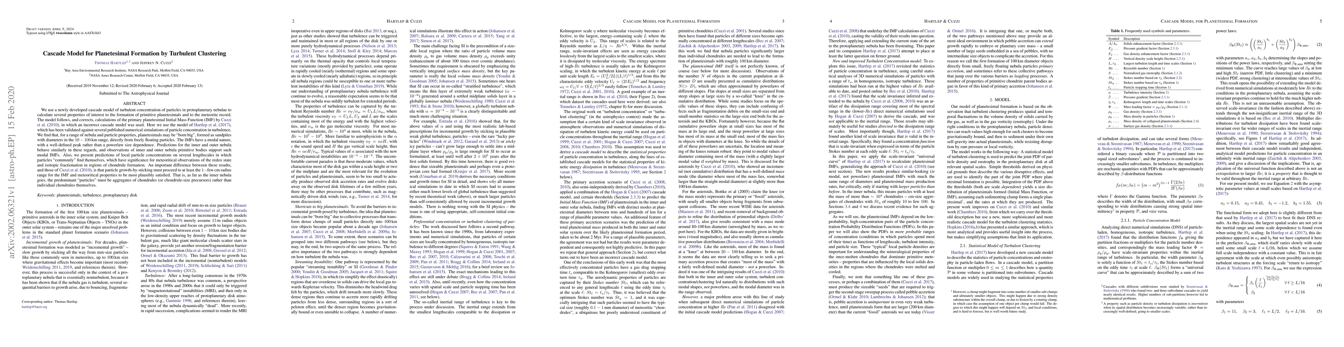 We use a newly developed cascade model of turbulent concentration of particles in protoplanetary nebulae to calculate several properties of interest to the formation of primitive planetesimals and to the meteorite record. The model follows, and corrects, calculations of the primary planetesimal Initial Mass Function (IMF) by Cuzzi et al. (2010), in which an incorrect cascade model was used. Here we use the model of Hartlep et al. (2017), which has been validated against several published numerical simulations of particle concentration in turbulence. We find that, for a range of nebula and particle properties, planetesimals may be "born big", formed as sandpiles with diameters in the 10-100 km range, directly from freely floating particles. The IMFs have a modal nature, with a well-defined peak rather than a powerlaw size dependence. Predictions for the inner and outer nebula behave similarly in these regards, and observations of inner and outer nebula primitive bodies support such modal IMFs. Also, we present predictions of local particle concentrations on several lengthscales in which particles "commonly" find themselves, which have significance for meteoritical observations of the redox state and isotopic fractionation in regions of chondrule formation. An important difference between these results, and those of Cuzzi et al. (2010), is that particle growth-by-sticking must proceed to at least the 1-few cm radius range for the IMF and meteoritical properties to be most plausibly satisfied. That is, as far as the inner nebula goes, the predominant "particles" must be aggregates of chondrules (or chondrule-size precursors) rather than individual chondrules themselves.