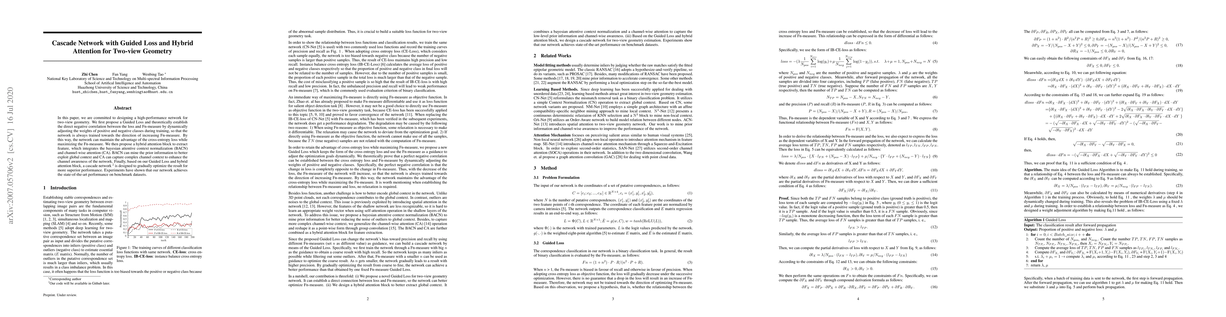 This paper proposes a cascade network with a Guided Loss and hybrid attention for two-view geometry, optimizing performance by dynamically adjusting weights for the Fn-measure. It integrates Bayesian attentive context normalization and channel-wise attention to enhance feature extraction, achieving state-of-the-art results on benchmark datasets.
