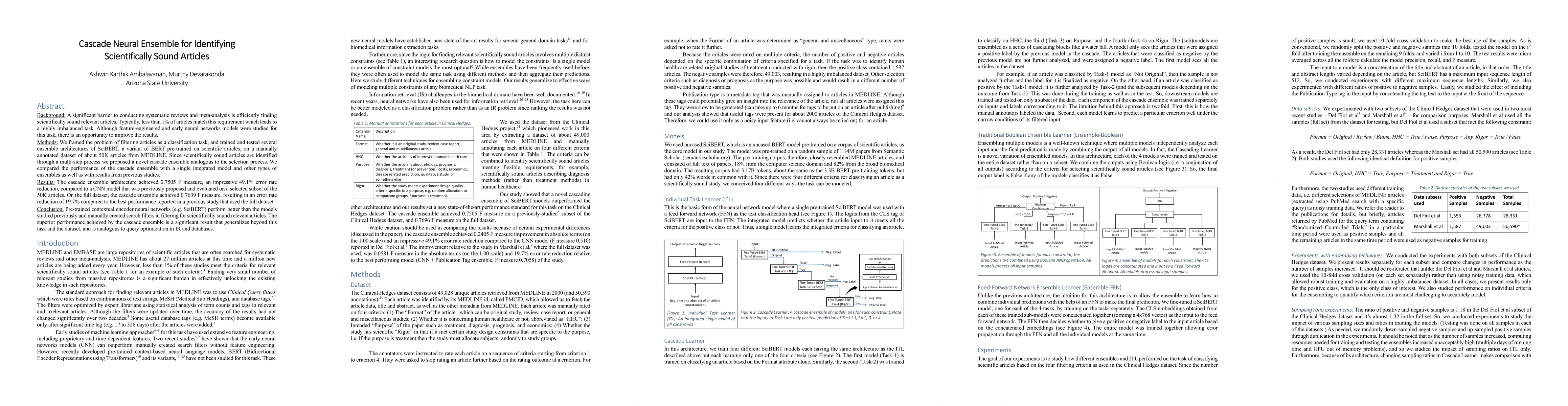The paper proposes a cascade neural ensemble using SciBERT to identify scientifically sound articles, achieving a 49.1% error rate reduction compared to previous models. The cascade ensemble outperforms single models and other ensemble types, demonstrating significant improvement in filtering relevant articles.