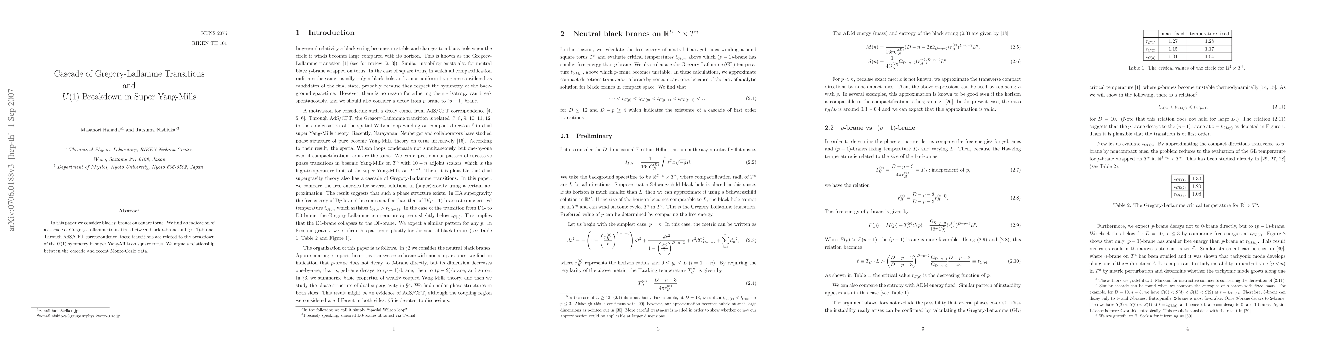 In this paper we consider black p-branes on square torus. We find an indication of a cascade of Gregory-Laflamme transitions between black p-brane and (p-1)-brane. Through AdS/CFT correspondence, these transitions are related to the breakdown of the U(1) symmetry in super Yang-Mills on torus. We argue a relationship between the cascade and recent Monte-Carlo data.