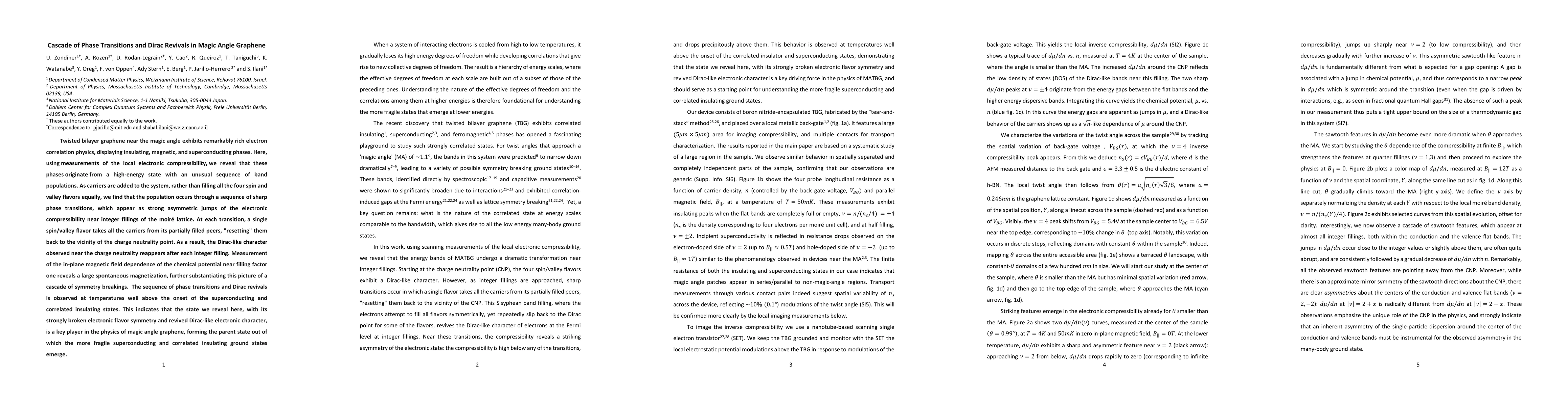 Twisted bilayer graphene near the magic angle exhibits remarkably rich electron correlation physics, displaying insulating, magnetic, and superconducting phases. Here, using measurements of the local electronic compressibility, we reveal that these phases originate from a high-energy state with an unusual sequence of band populations. As carriers are added to the system, rather than filling all the four spin and valley flavors equally, we find that the population occurs through a sequence of sharp phase transitions, which appear as strong asymmetric jumps of the electronic compressibility near integer fillings of the moire lattice. At each transition, a single spin/valley flavor takes all the carriers from its partially filled peers, "resetting" them back to the vicinity of the charge neutrality point. As a result, the Dirac-like character observed near the charge neutrality reappears after each integer filling. Measurement of the in-plane magnetic field dependence of the chemical potential near filling factor one reveals a large spontaneous magnetization, further substantiating this picture of a cascade of symmetry breakings. The sequence of phase transitions and Dirac revivals is observed at temperatures well above the onset of the superconducting and correlated insulating states. This indicates that the state we reveal here, with its strongly broken electronic flavor symmetry and revived Dirac-like electronic character, is a key player in the physics of magic angle graphene, forming the parent state out of which the more fragile superconducting and correlated insulating ground states emerge.