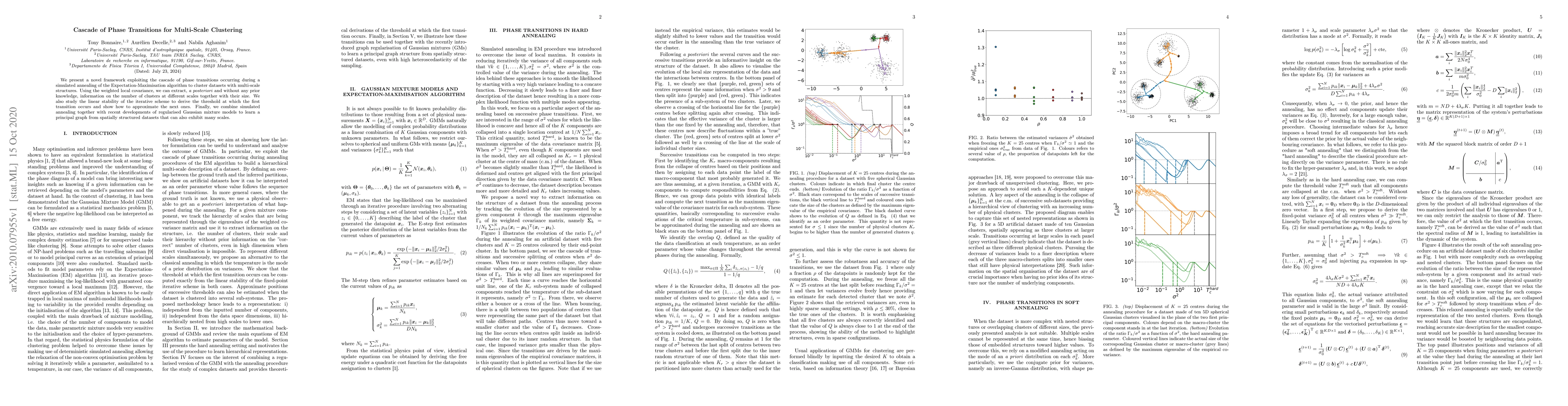 We present a novel framework exploiting the cascade of phase transitions occurring during a simulated annealing of the Expectation-Maximisation algorithm to cluster datasets with multi-scale structures. Using the weighted local covariance, we can extract, a posteriori and without any prior knowledge, information on the number of clusters at different scales together with their size. We also study the linear stability of the iterative scheme to derive the threshold at which the first transition occurs and show how to approximate the next ones. Finally, we combine simulated annealing together with recent developments of regularised Gaussian mixture models to learn a principal graph from spatially structured datasets that can also exhibit many scales.