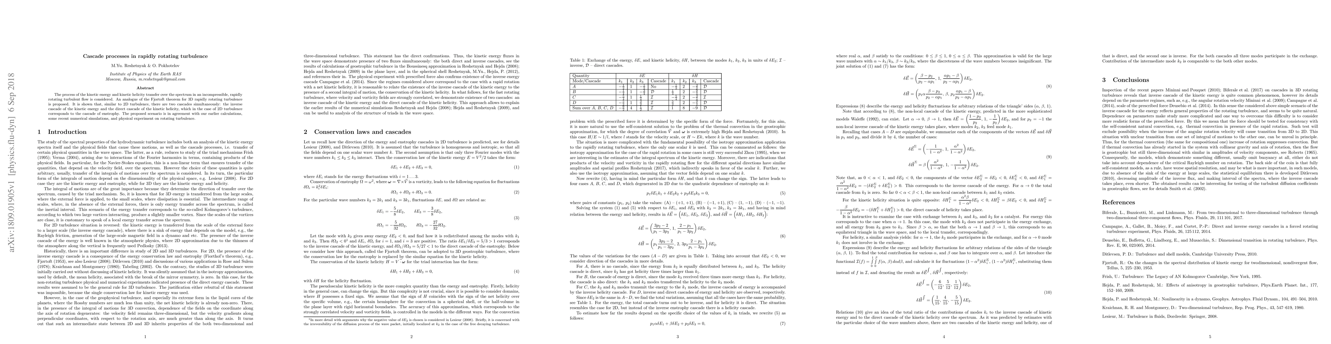 The process of the kinetic energy and kinetic helicity transfer over the spectrum in an incompressible, rapidly rotating turbulent flow is considered. An analogue of the Fjortoft theorem for 3D rapidly rotating turbulence is proposed. It is shown that, similar to 2D turbulence, there are two cascades simultaneously: the inverse cascade of the kinetic energy and the direct cascade of the kinetic helicity, which in the case of 2D turbulence corresponds to the cascade of enstrophy. The proposed scenario is in agreement with our earlier calculations, some recent numerical simulations, and physical experiment on rotating turbulence.