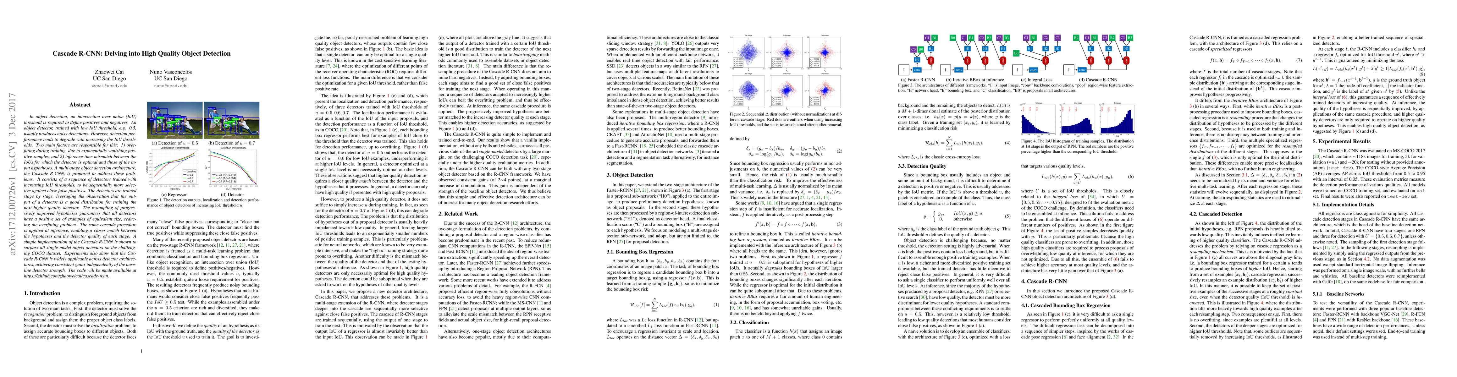 In object detection, an intersection over union (IoU) threshold is required to define positives and negatives. An object detector, trained with low IoU threshold, e.g. 0.5, usually produces noisy detections. However, detection performance tends to degrade with increasing the IoU thresholds. Two main factors are responsible for this: 1) overfitting during training, due to exponentially vanishing positive samples, and 2) inference-time mismatch between the IoUs for which the detector is optimal and those of the input hypotheses. A multi-stage object detection architecture, the Cascade R-CNN, is proposed to address these problems. It consists of a sequence of detectors trained with increasing IoU thresholds, to be sequentially more selective against close false positives. The detectors are trained stage by stage, leveraging the observation that the output of a detector is a good distribution for training the next higher quality detector. The resampling of progressively improved hypotheses guarantees that all detectors have a positive set of examples of equivalent size, reducing the overfitting problem. The same cascade procedure is applied at inference, enabling a closer match between the hypotheses and the detector quality of each stage. A simple implementation of the Cascade R-CNN is shown to surpass all single-model object detectors on the challenging COCO dataset. Experiments also show that the Cascade R-CNN is widely applicable across detector architectures, achieving consistent gains independently of the baseline detector strength. The code will be made available at https://github.com/zhaoweicai/cascade-rcnn.