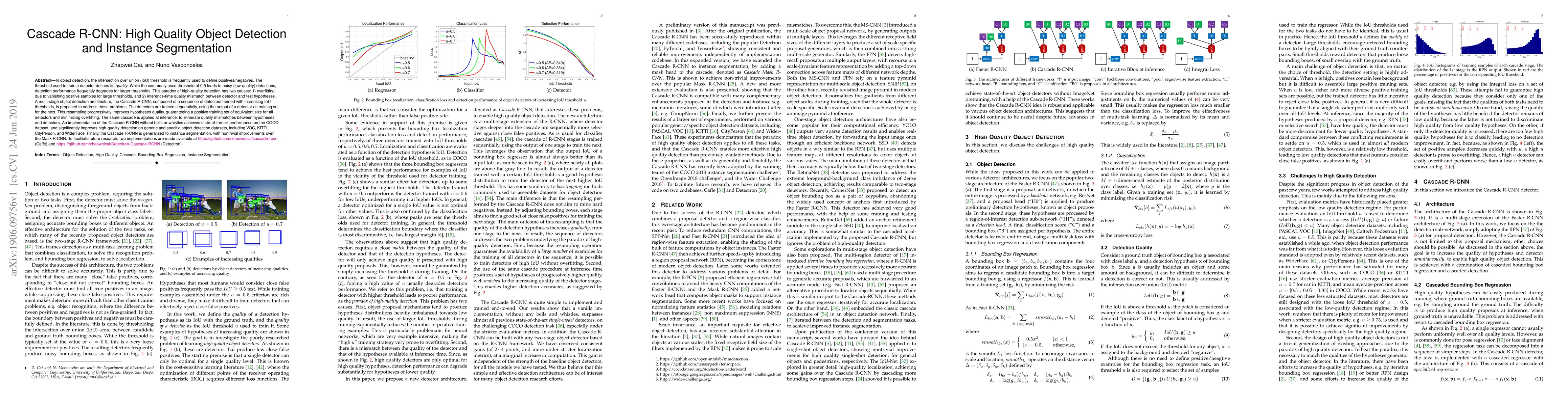 The Cascade R-CNN addresses the paradox of high-quality object detection by using a multi-stage architecture that trains detectors sequentially with increasing IoU thresholds, improving hypothesis quality and minimizing overfitting, achieving state-of-the-art results on various datasets and extending to instance segmentation with notable improvements over Mask R-CNN.