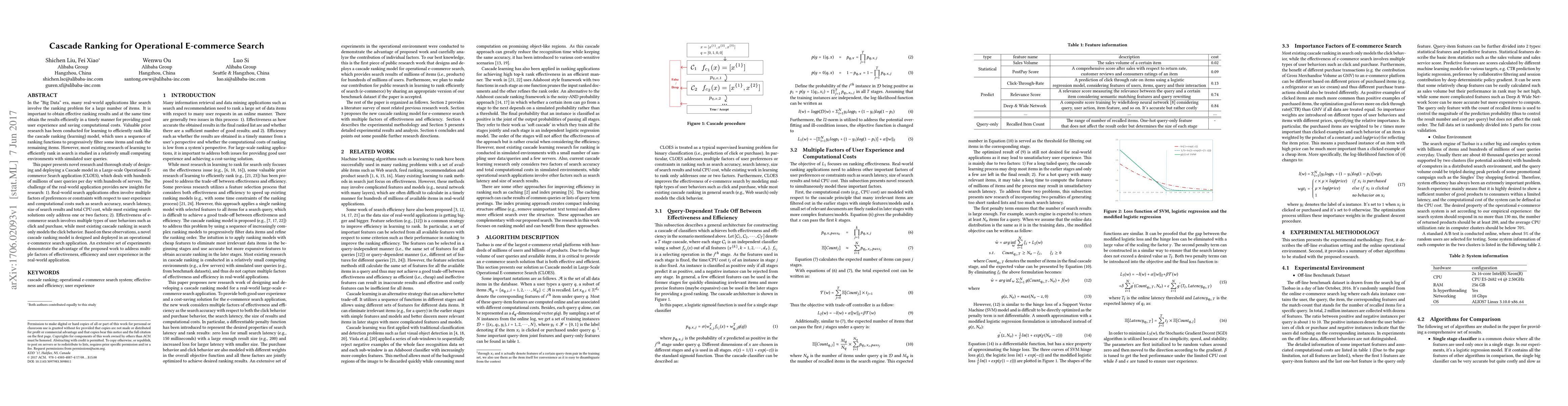 This paper introduces a novel Cascade Ranking model for a Large-scale Operational E-commerce Search application (CLOES) to handle hundreds of millions of daily queries efficiently. It addresses multiple factors like search accuracy, latency, and computational costs, and models various user behaviors beyond just clicks, demonstrating improved effectiveness and efficiency in real-world search scenarios.