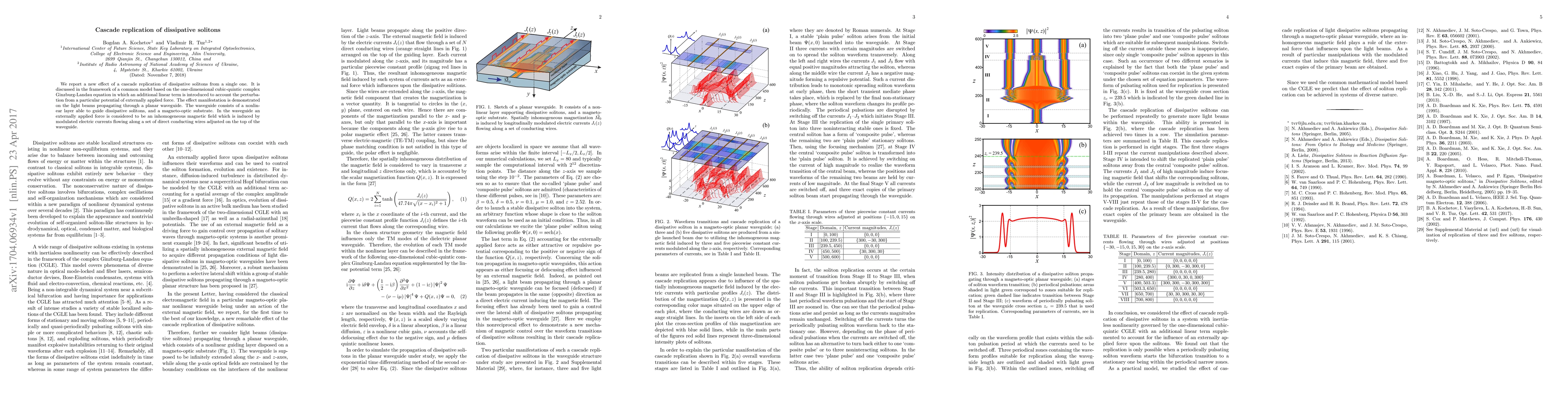 We report a new effect of a cascade replication of dissipative solitons from a single one. It is discussed in the framework of a common model based on the one-dimensional cubic-quintic complex Ginzburg-Landau equation in which an additional linear term is introduced to account the perturbation from a particular potential of externally applied force. The effect manifestation is demonstrated on the light beams propagating through a planar waveguide. The waveguide consists of a nonlinear layer able to guide dissipative solitons, and a magneto-optic substrate. In the waveguide an externally applied force is considered to be an inhomogeneous magnetic field which is induced by modulated electric currents flowing along a set of direct conducting wires adjusted on the top of the waveguide.