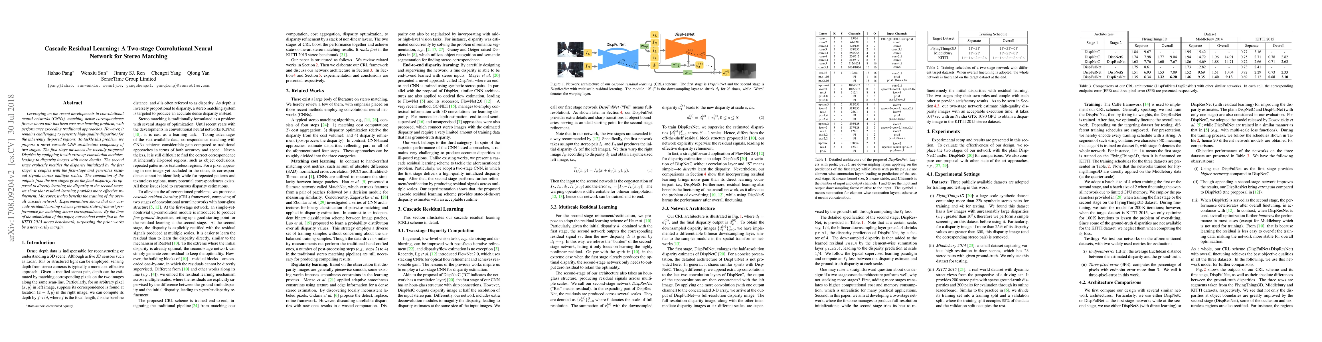 This paper proposes a two-stage convolutional neural network for stereo matching, enhancing the DispNet with additional up-convolution modules in the first stage and a second stage that refines disparities using residual learning. The cascade approach achieves state-of-the-art performance on the KITTI 2015 stereo benchmark.