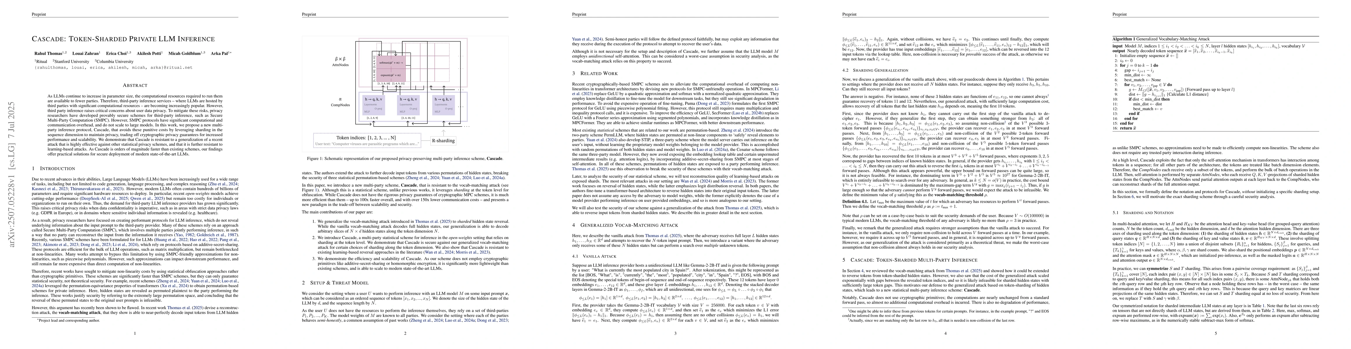 As LLMs continue to increase in parameter size, the computational resources required to run them are available to fewer parties. Therefore, third-party inference services -- where LLMs are hosted by third parties with significant computational resources -- are becoming increasingly popular. However, third party inference raises critical concerns about user data privacy. To mitigate these risks, privacy researchers have developed provably secure schemes for third-party inference, such as Secure Multi-Party Computation (SMPC). However, SMPC protocols have significant computational and communication overhead, and do not scale to large models. In this work, we propose a new multi-party inference protocol, Cascade, that avoids these punitive costs by leveraging sharding in the sequence dimension to maintain privacy, trading off cryptographic privacy guarantees for increased performance and scalability. We demonstrate that Cascade is resistant to a generalization of a recent attack that is highly effective against other statistical privacy schemes, and that it is further resistant to learning-based attacks. As Cascade is orders of magnitude faster than existing schemes, our findings offer practical solutions for secure deployment of modern state-of-the-art LLMs.