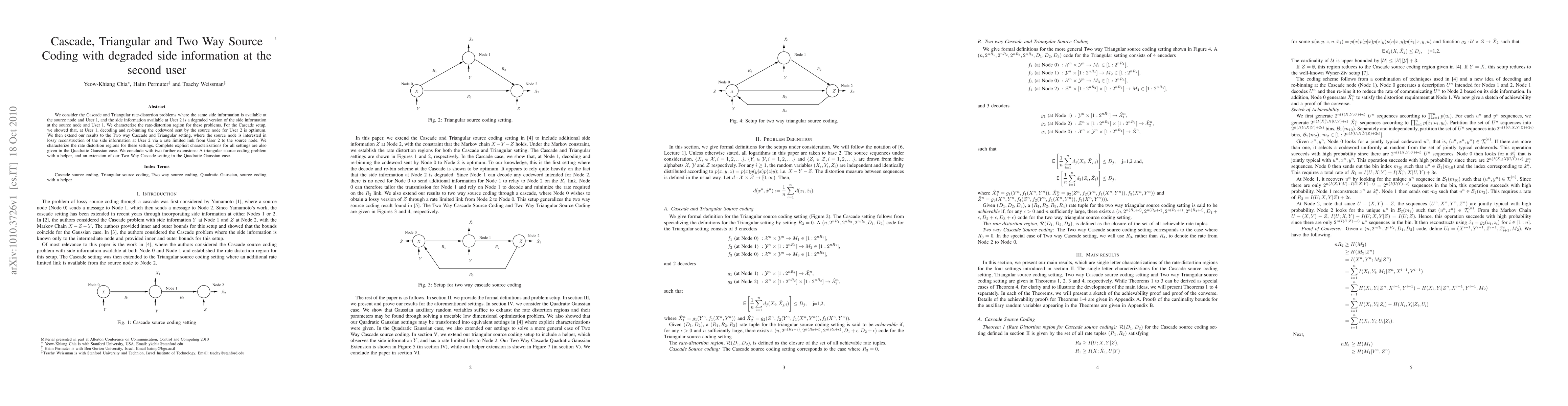Researchers study source coding problems with degraded side information at User 2, finding optimal solutions for cascade and triangular setups with rate-distortion regions characterized in various cases.