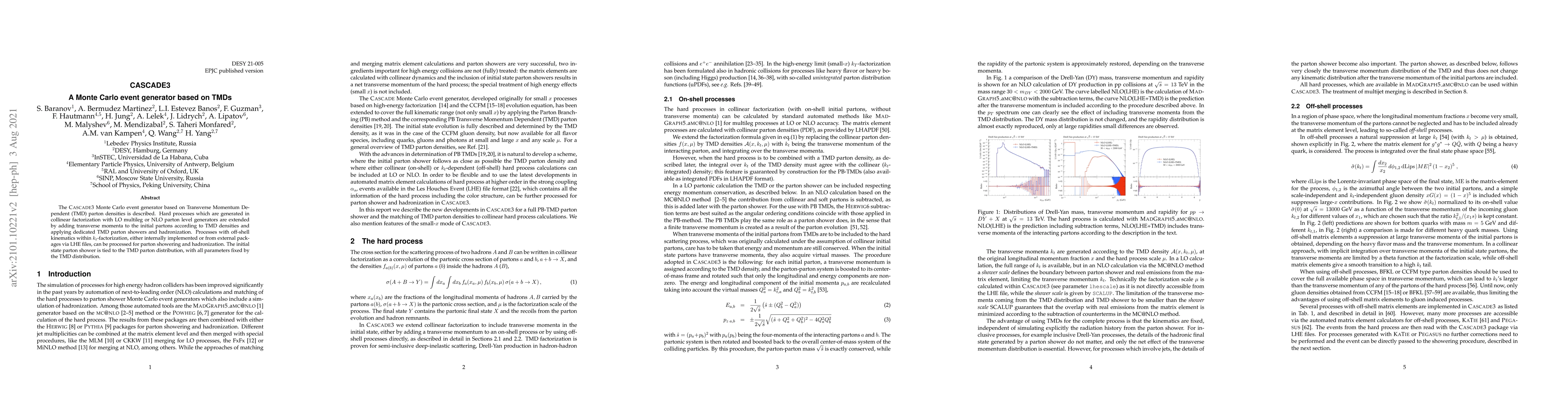 CASCADE3 is a Monte Carlo event generator that incorporates Transverse Momentum Dependent (TMD) parton densities to extend hard processes generated by LO or NLO parton level generators. It includes TMD parton showers and hadronization, and can handle off-shell kinematics within $k_t$-factorization.
