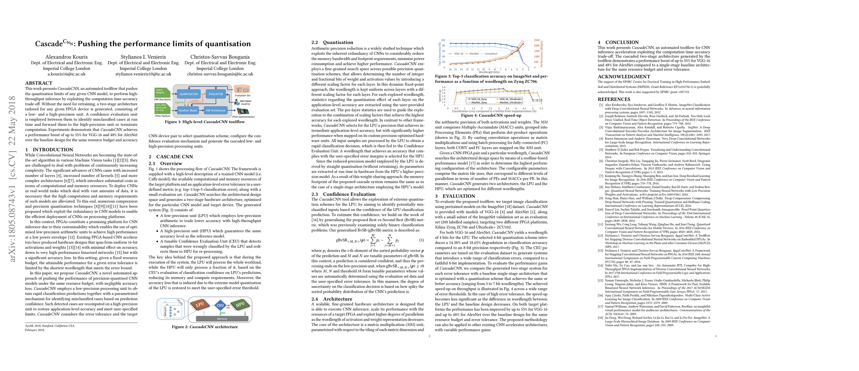 This work presents CascadeCNN, an automated toolflow that pushes the quantisation limits of any given CNN model, to perform high-throughput inference by exploiting the computation time-accuracy trade-off. Without the need for retraining, a two-stage architecture tailored for any given FPGA device is generated, consisting of a low- and a high-precision unit. A confidence evaluation unit is employed between them to identify misclassified cases at run time and forward them to the high-precision unit or terminate computation. Experiments demonstrate that CascadeCNN achieves a performance boost of up to 55% for VGG-16 and 48% for AlexNet over the baseline design for the same resource budget and accuracy.