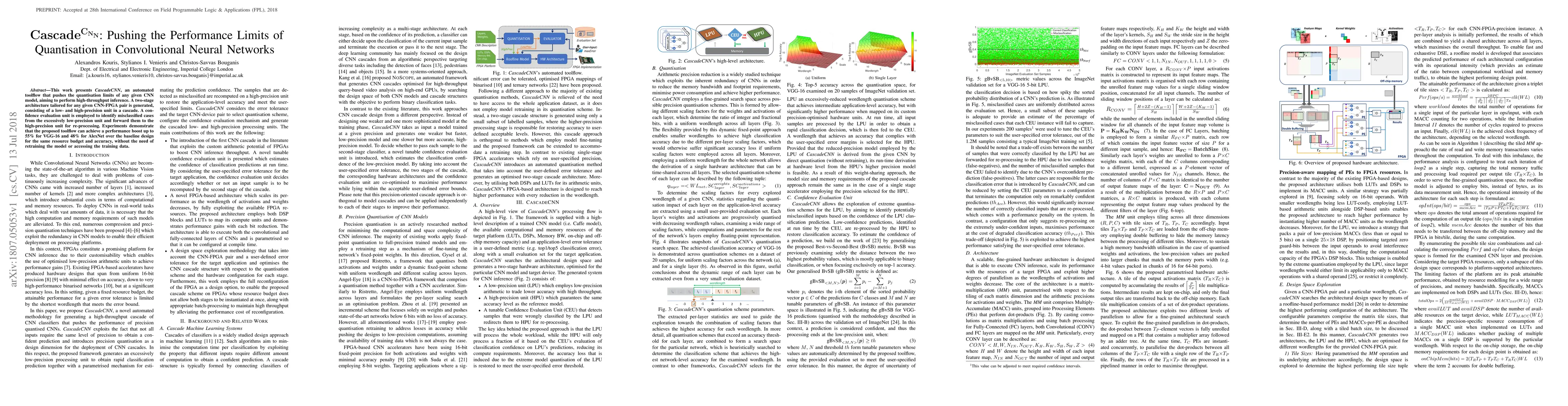 This work presents CascadeCNN, an automated toolflow that pushes the quantisation limits of any given CNN model, aiming to perform high-throughput inference. A two-stage architecture tailored for any given CNN-FPGA pair is generated, consisting of a low- and high-precision unit in a cascade. A confidence evaluation unit is employed to identify misclassified cases from the excessively low-precision unit and forward them to the high-precision unit for re-processing. Experiments demonstrate that the proposed toolflow can achieve a performance boost up to 55% for VGG-16 and 48% for AlexNet over the baseline design for the same resource budget and accuracy, without the need of retraining the model or accessing the training data.