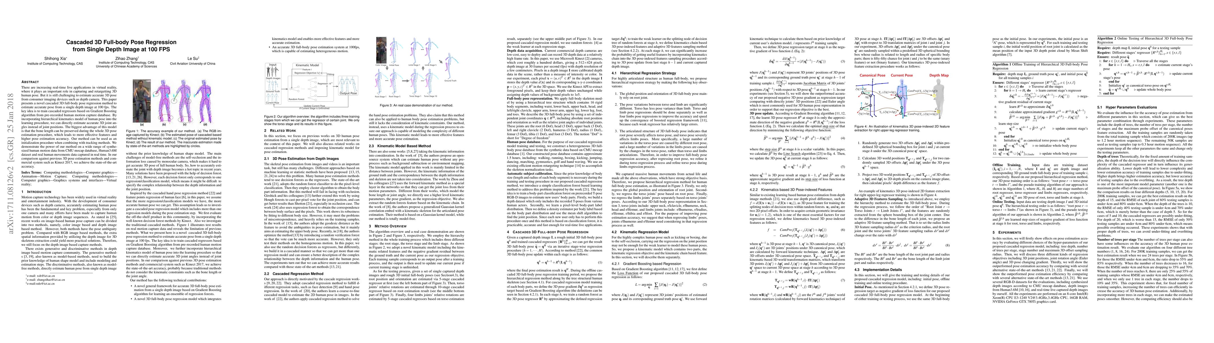 There are increasing real-time live applications in virtual reality, where it plays an important role in capturing and retargetting 3D human pose. But it is still challenging to estimate accurate 3D pose from consumer imaging devices such as depth camera. This paper presents a novel cascaded 3D full-body pose regression method to estimate accurate pose from a single depth image at 100 fps. The key idea is to train cascaded regressors based on Gradient Boosting algorithm from pre-recorded human motion capture database. By incorporating hierarchical kinematics model of human pose into the learning procedure, we can directly estimate accurate 3D joint angles instead of joint positions. The biggest advantage of this model is that the bone length can be preserved during the whole 3D pose estimation procedure, which leads to more effective features and higher pose estimation accuracy. Our method can be used as an initialization procedure when combining with tracking methods. We demonstrate the power of our method on a wide range of synthesized human motion data from CMU mocap database, Human3.6M dataset and real human movements data captured in real time. In our comparison against previous 3D pose estimation methods and commercial system such as Kinect 2017, we achieve the state-of-the-art accuracy.