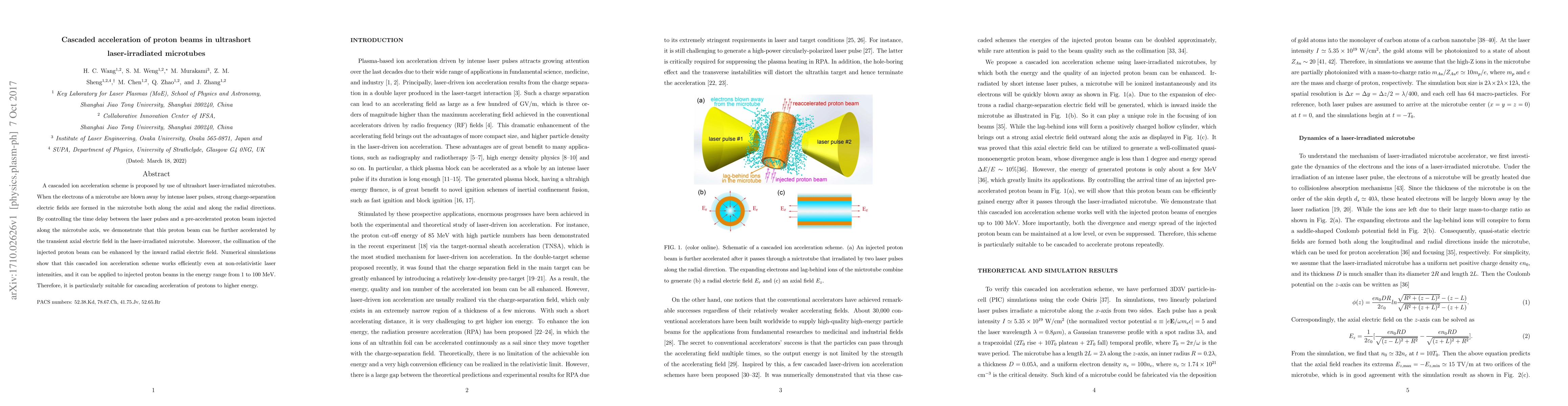 This paper proposes a cascaded ion acceleration method using ultrashort laser-irradiated microtubes, where intense laser pulses create strong electric fields that further accelerate pre-accelerated proton beams. The method enhances both the acceleration and collimation of proton beams, working efficiently at non-relativistic laser intensities.